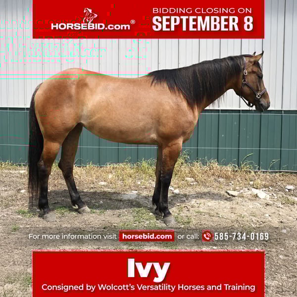 ♦️ 𝐭𝐡𝐞 𝐒𝐞𝐩𝐭𝐞𝐦𝐛𝐞𝐫 𝑺𝒆𝒍𝒆𝒄𝒕 ♦️ Happening now thru MONDAY | SEPTEMBER 8th - Available EXCLUSIVELY on HorseBid's website! For more details and to register visit: www.Horsebid.com CONSIGNOR CONTACT: Wolcott’s Versatility Horses and Training 585-734-0169 LOCATION: Warsaw, NY BREED: AQHA REGISTERED: Yes REGISTERED NAME: JAK MS BLUE SNIP 634 COLOR: Dun HEIGHT: 15.2 AGE: 5 GENDER: Mare JAK MS BLUE SNIP 634 “Ivy” 2020 AQHA Dun Mare that stands at 15.2hh. She’s the kind of horse that’s easy to fall in love with, beautiful, well-built, and incredibly versatile. We’ve owned Ivy since she was a yearling, and she’s been a joy to bring along. She’s smart, willing, and picks up new things quickly. She's ready and able, whether you’re hitting the trails, working obstacles, riding in parades, competition with drill team, or heading to a show. Ivy has a smooth, natural gait, walks on a loose rein, and carries a slow, collected lope that’s an absolute dream to ride. She neck reins, is soft in the face and throughout her body. She’s been extensively ridden on trails, been on camping trips, competed in obstacle courses all over NY, and competed in a jumping derby. She has been shown by 4-H youth, in showmanship, western pleasure, English on the rail and over fences, drill team, and gymkhana games. She even qualified for the state fair after a strong showing at the county level. Ivy is confident, sure-footed, traffic-safe, dog-safe, and patient. She loads easily, stands quietly, and handles new environments like a pro. She’s the total package! She has no vices and is happy living inside the barn or out on the pasture. Finding a young horse with this kind of brain and experience is rare. Whether you're looking for a solid show partner or a dependable trail mount, Ivy won’t disappoint. Ivy is located in Warsaw, NY.