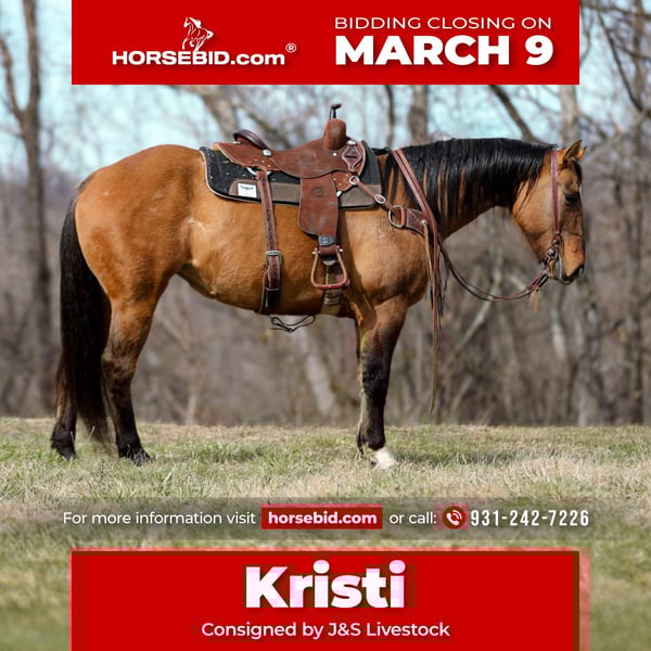 ℳ𝒶𝓇𝒸𝒽 ♦️𝐑𝐈𝐃𝐄𝐑'𝐒 𝐂𝐇𝐎𝐈𝐂𝐄♦️ Happening now thru MONDAY | MARCH 9th - Available EXCLUSIVELY on HorseBid's website! For more details and to register visit: www.Horsebid.com CONSIGNOR CONTACT: J&S Livestock 931-242-7226 LOCATION: Santa Fe, TN BREED: Quarter Horse REGISTERED: Yes REGISTERED NAME: Comets Kristaria COLOR: Dun HEIGHT: 14.3 AGE: 6 GENDER: Mare Comets Kristaria AKA Kristi Kristi is 2020 model AQHA mare standing at a perfect 14.3 hands. This mare has been such a joy to our family. With her graceful, and kind manners on and off her back it would make it hard for almost anyone to not get along with this mare. For just a 6yr old, she has the attitude of an older horse. Shes quiet, respectful and most of all wants to take care of her rider. Kristi is an excellent trail horse, we’ve yet to find much she will shy away from- from busy traffic in town, to rocky grounds, to wildlife, and especially water- this mare loves the water and will take you through it all day long if you let her! She will be surefooted and sturdy at all cost. Kristi will always take you where you want to go and is sure to make it enjoyable. She has been rode by many different ages and has never failed at staying safe for them. I think Kristi would also excel well into a performance aspect, shes quick on her feet, and goes to a cow nicely. We’ve used her a ton to pony colts around our farm, and to gather up cattle. She has smooth lead changes and a nice lope that makes it desirable for most anyone. This is the type of mare that will be the same horse everyday you go to pull her out of a stall or the pasture. She’s honest and safe, with a been there done that type of attitude. She gets along well with other horses, trailers perfectly, and is easy to saddle. Kristi has no vices or bad habits. This is just an all around gentle, solid mare that would truly make anyone happy to own. Kristi has a current coggins and basic PPE. For any further information regarding Kristi, feel free to call or text- J.T. 931-698-7159 or Bailey 931-242-7226