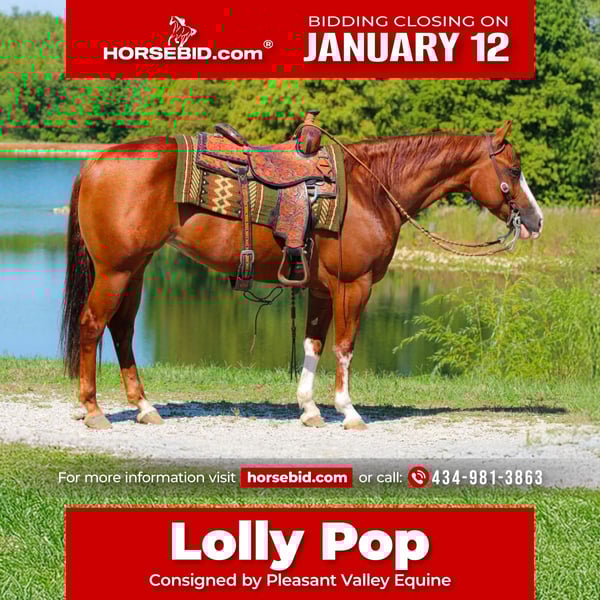 ♦️𝐍𝐄𝐖 𝐘𝐄𝐀𝐑'𝐒 𝑬𝒙𝒕𝒓𝒂𝒗𝒂𝒈𝒂𝒏𝒛𝒂♦️ Happening now thru MONDAY | JANUARY 12th - Available EXCLUSIVELY on HorseBid's website! For more details and to register visit: www.Horsebid.com CONSIGNOR CONTACT: Pleasant Valley Equine 434-981-3863 LOCATION: Robards, KY BREED: AQHA/APHA REGISTERED: Yes REGISTERED NAME: Not A Ruff Lolly COLOR: Sorrel HEIGHT: 14.3 AGE: 6 GENDER: Mare Check out this beautiful mare. She has all the flash & the pedigree. Double Registered AQHA & APHA. With one fancy set of papers. She is sired by the famous $2 million dollar sire Not Ruff At All & out of a proven show mare. "Lolly Pop" will make you look like a professional. With extensive training in the reining. She's easy to operate and fun. She has absolutely all the training needed to hit the NRHA shows; big sliding stops, spins, speed control with a simple voice command, sidepass & quick and fancy roll backs. She has a true one-hand neck rein. Lolly would excel in Ranch Versatility, Ranch Riding, 4H Reiner, Trail, Western Riding, Ranch Reining, Queen Contest, Equitation, and Western Dressage. Great for the ARHA shows! UTD on vaccinations, coggins, and dental. She stands great for the farrier, baths, clips and loads in and out of the trailer with ease. Call today to set up an appointment to meet Lolly Pop. CALL Jessica at 434-981-3863