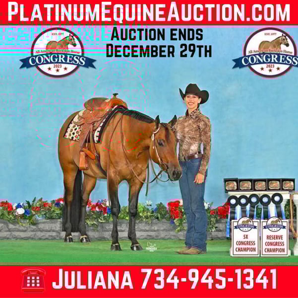 ONLINE AUCTION Place your bids at www.PlatinumEquineAuction.com Starting Bid $3500 Auction ends December 29th, 2024 Need a new saddle? Check out White Rock Saddles on our website or Facebook! Ramona Dun Did It Aka Reba is a 2020 registered AQHA/NSBA/IBHA/ABRA 15.2 hand mare looking for a new home! Don’t let her age fool you; she’s done it all with a quiet, easy-going personality! She has shown all around the last two years, everything from trail to showmanship. Reba could easily switch and excel in the ranch division. She has been leased out to junior and high school equestrian team students for the last two years; the kids love her! Easy keeper, no vices, and no maintenance. Ridden in parades as a 3yo for my high school students during homecoming season and has continued participating in multiple parades since. 5x Buckskin Congress champion 2023. Register of Merit and Honor Roll awards from ABRA. GLBA Queen Horse 2023. Has been started over low fences. Also been on trails. Negative Coggins and UTD on shots and worming. Teeth were done in the spring. Located in Hamilton, AL. Contact Juliana Juback 734-945-1341 with any questions. ONLINE AUCTION Place your bids at www.PlatinumEquineAuction.com Starting Bid $3500 Auction ends December 29th, 2024 Need a new saddle? Check out White Rock Saddles on our website or Facebook!
