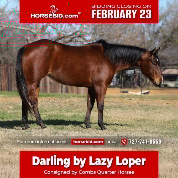 💎 𝐓𝐇𝐄 𝓓𝓲𝓪𝓶𝓸𝓷𝓭 𝐒𝐇𝐎𝐖𝐂𝐀𝐒𝐄 💎 Happening now thru MONDAY | FEBRUARY 23rd - Available EXCLUSIVELY on HorseBid's website! For more details and to register visit: www.Horsebid.com CONSIGNOR CONTACT: Combs Quarter Horses 727-741-0559 LOCATION: Cleburne, TX BREED: AQHA REGISTERED: Yes REGISTERED NAME: HelloYouLazyDoll by LAZY LOPER COLOR: Bay HEIGHT: 14.2 AGE: 7 GENDER: Mare Perfect tried and true all around mare with the most sensible, go with the flow kind of attitude! HelloYouLazyDoll (Lazy Loper x Sweet Invite) “Darling” is the cutest 7yr old 14.2h bay mare by the one and only superior western pleasure and leading producing stallion, Lazy Loper! This girl is the best of both worlds! She’s got the top of the line pedigree, phenomenal flat movement all packed into the best easy on, easy off size you could ask for! DISPOSITION: Darling is a very sweet mare that’s very easy to get along with. She is easy to catch and very easy to handle. She will stand all day for washing and grooming and loves cookies! She’s a very “old soul” type of girl that we love!! Darling is very suitable for all ages and all sizes. I wouldn’t hesitate to say she would be a great fit for a family, a lesson program or even a first horse. She’s very forgiving with a more push style type of ride. Darling can also sit for longer periods between rides and stay gentle! WESTERN EXPERIENCE: Darling was started as a ranch rider. She’s got all the buttons and knows what to do when she’s asked. She moves very well off of your seat and she’s is responsive to your leg without being overly sensitive or responsive making her suitable for the less experienced riders as well. Darlings main job so far has actually been trail riding. She will go over, under and through anything you point her nose at. She doesn’t mind water, ditches, logs, wildlife, traffic… you name it.. she’s very go with the flow and even tempered. Rides quietly with a level headset and a loose rein. She’s a kick back and enjoy the ride kind of girl for sure! ENGLISH EXPERIENCE: Darling is just starting her English career and seems to really enjoy it. She’s got the most perfect little trot that’s very easy to post to and she’s taking right to the jumping. Darling has a bright future in the hunter ring if you decide to go that route with her! With her floaty trot and flat canter.. she will be one to watch for in the flat classes for sure! UPKEEP: Darling is a very easy keeper. She eats free choice alfalfa with just 1/2 scoop of a basic pellet. No supplements or maintenance required to keep this girl sound! She is UTD on everything and wearing just a basic front shoe as a personal preference. TURNOUT: Darling is currently stalled part of the day and turned out with a mixed herd for the other part of the day. She’s very quiet and minds her business. GROUND MANNERS: Darling has great ground manners. She can be lead around by even the little kiddos. She’s very respectful of your personal space. Stands great for washing, grooming, saddling, bridling and mounting! She also stands single tied and cross-tied. BAD HABITS/VICES: Darling has no real bad habits or vices. She will occasionally make a mean face but she’s never made any mean moves. No bite, kick, buck, rear or bolt. TACK: Darling rides English, western or bareback. She will ride in a halter and lead rope, a plain snaffle or even just a short shank snaffle. Please feel free to contact me for any further information at 727-741-0559. This is a Florida number that I’ve had for years.