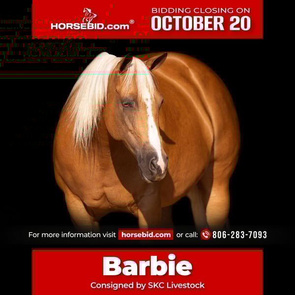 ♦️ 𝐭𝐡𝐞 𝐀𝐌𝐄𝐑𝐈𝐂𝐀𝐍 𝓕𝓪𝓵𝓵 𝓒𝓵𝓪𝓼𝓼𝓲𝓬 ♦️ Happening now thru MONDAY | OCTOBER 20th - Available EXCLUSIVELY on HorseBid's website! For more details and to register visit: www.Horsebid.com CONSIGNOR CONTACT: SKC Livestock 806-283-7093 LOCATION: Canyon TX BREED: Quarter Horse REGISTERED: Yes REGISTERED NAME: Trout Town Sass COLOR: Palomino HEIGHT: 15.1 AGE: 6 GENDER: Mare This stunning 15.1 hand Palomino mare is the complete package—big-bodied, dark golden in color, with a long, flowing white mane and tail that make her look straight out of a picture book. Barbie has earned over $1600 in the reining! She’s as smooth as they come to ride and has all the style and athleticism you could ask for in the show pen. With a powerful stop, effortless lead changes, stylish circles, and beautiful spins, she is a true competitor ready to take someone to the next level. Not only does she excel in reining maneuvers, but his eye appeal, size, and disposition make her a perfect candidate for the ranch riding and versatility events as well. Barbie is a beautiful mover and She carries herself with presence and class, making every maneuver look easy. This gorgeous mare has the kindest heart, is always willing, and is the type of horse that’s a joy to be around every single day. She is the definition of versatile, talented, and classy—a golden partner in and out of the arena. Please Call Us at 806-282-7093.