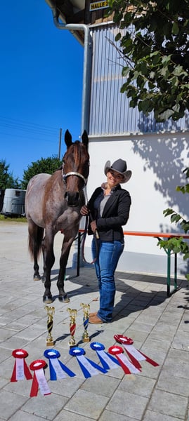 Beautiful, large-framed Quarter Horse mare by top sire VS CODE RED out of a Lazy Loper x One Hot Krymsun mare. "Lotti" has been in my possession since she was four weeks old. She is a true sweetheart: honest, intelligent, fearless. She has always lived outdoors in a herd of mares and gets along very well there. At four years old, she competed for a year in sport, impressing in the Young Horse Basics, Young Horse Trail, as well as Junior Trail and Pleasure classes. Among other achievements, she placed in both the Young Horse classes (Trail + Basics) at the German Open. Lotti has some health issues, which prevent her from competing at an ambitious level anymore. She requires special shoeing and regular, meticulous hoof care. In good phases, she is conditionally rideable. More details can be discussed personally. She is explicitly not sold as a riding horse, especially not for competition purposes. I am looking for a home with plenty of free movement, either in an open or active stall, and someone who will handle her according to her health condition. I could also see her as a breeding mare. Lotti is vaccinated (EHV, Influenza, Tetanus, West Nile), dewormed three times a year, and is shoe- and loading-trainable. This is not an urgent sale – she will only go to a proven, caring home!