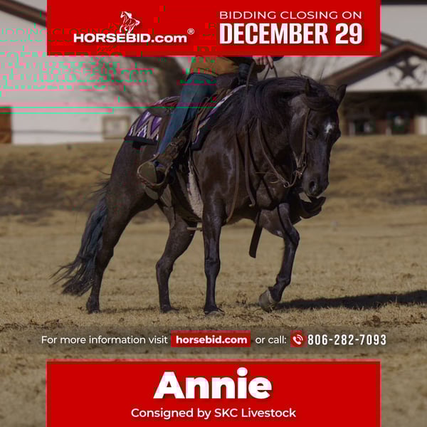 ⚜️ 𝓗𝓮𝓻𝓲𝓽𝓪𝓰𝓮 𝐖𝐢𝐧𝐭𝐞𝐫 𝓒𝓵𝓪𝓼𝓼𝓲𝓬⚜️ Happening now thru MONDAY | DECEMBER 29th - Available EXCLUSIVELY on HorseBid's website! For more details and to register visit: www.Horsebid.com CONSIGNOR CONTACT: SKC Livestock 806-282-7093 LOCATION: Canyon, TX BREED: Quarter REGISTERED: Yes REGISTERED NAME: ANIE DOT COM COLOR: Blue Roan HEIGHT: . AGE: 7 GENDER: Mare This super fun, gentle blue roan mare is the kind everyone is looking for — handy sized, absolutely beautiful, and genuinely safe for youth, non-pros, and riders of any level. She has a sweet personality that’s easy to love, paired with a quiet, kind demeanor and natural athleticism that makes her a joy to ride and be around every single day. She is sired by Boon A Little, an earner of over $118,000 and a producer of more than $1 million, and out of the great mare MS Highliner, a proven producer with $384,855. Her pedigree speaks for itself, yet her calm mind and rideability are what truly set her apart. This mare is a great mover with the ability to be very competitive in the show pen, while remaining uncomplicated and user-friendly for youth and non-pro riders. She has been used to doctor cattle outside and is a favorite for early morning shipping and sorting, staying quiet, attentive, and dependable in real-world ranch situations. Athletic without being hot and responsive without being intimidating, she stays very gentle, forgiving, and good-minded. She crosses water and rocky country with ease, is sure-footed and confident, and is incredibly easy to ride and handle — the kind that builds confidence rather than taking it away. A rare combination of beauty, pedigree, gentleness, versatility, and a personality you can’t help but fall in love with, this blue roan mare is truly the total package for a youth, non-pro, or family-oriented program, while still having the ability to shine in the show pen or sorting pen.