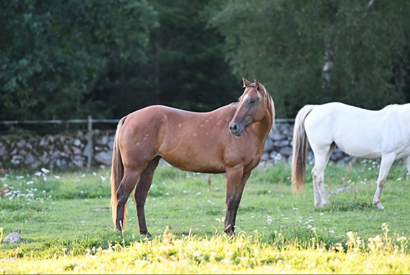 Jument de reproduction unique, à la recherche d’un nouveau bon foyer. Homozygote pour le gène de couleur le plus rare chez le quarter horse, le bay argenté, une opportunité exceptionnelle pour les éleveurs souhaitant associer couleur et qualité. E/e A/a Z/Z, totalement exempt de MCOA, ainsi que ses descendants. 7 panel n/n. Entièrement saine, facile à faire reproduire, les poulains naissent facilement, excellente mère et facile d’entretien. Facile pour le maréchal-ferrant, le vétérinaire, le chargement, sociable en troupeau, rang inférieur dans la hiérarchie. Montée, très bien dressée, calme et docile. Principalement utilisée comme jument de reproduction. Elle a été importée des États-Unis. Elle donne des poulains de reining d’un potentiel exceptionnel. Son poulain de 2025, par Einsteins Revolution, est magnifique et cherche également un nouveau foyer. Raison de la vente : trop de chevaux. Prix raisonnable en raison de cela. Elle se trouve en Suède. Contactez-moi pour plus d’informations.
