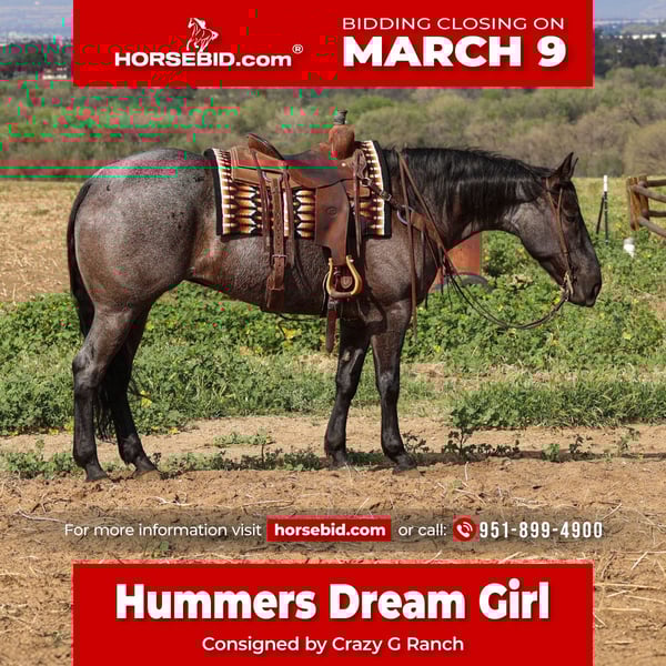 ℳ𝒶𝓇𝒸𝒽 ♦️𝐑𝐈𝐃𝐄𝐑'𝐒 𝐂𝐇𝐎𝐈𝐂𝐄♦️ Happening now thru MONDAY | MARCH 9th - Available EXCLUSIVELY on HorseBid's website! For more details and to register visit: www.Horsebid.com CONSIGNOR CONTACT: Crazy G Ranch 951-899-4900 LOCATION: Norco, CA BREED: Quarter horse REGISTERED: Yes REGISTERED NAME: HUMMERS DREAM GIRL COLOR: Blue roan HEIGHT: 16.2 AGE: 8 GENDER: Mare 💙”HUMMERS DREAM GIRL” aka Denali – Registered Blue Roan Mare 💙 If you’re looking for that rare combination of beauty, brains, and family-safe — meet Denali. Denali is a gorgeous registered blue roan mare that truly checks all the boxes. She is the perfect family, all-around horse with the kind of mind everyone wants in their barn. She is confident and steady around: ✔ Scary obstacles ✔ Tarps ✔ Barking dogs ✔ Street traffic Nothing seems to rattle her — she stays quiet, willing, and level-headed. In the arena, Denali is fancy broke with a soft handle and smooth transitions. She rides collected when asked and is enjoyable for both experienced riders and those still learning. Outside the arena, she’s a finished trail horse, confident and sure-footed wherever you point her. Most importantly, she is kid friendly with a kind, patient demeanor that makes her a safe and trustworthy partner for the whole family. Denali is the kind that’s hard to find — pretty enough to turn heads, gentle enough for the kids, and broke enough for the experienced rider to appreciate. If you have any questions about our sweet Denali please contact us at: 951-531-4346 951-899-4900 Shipping is available all over the US!