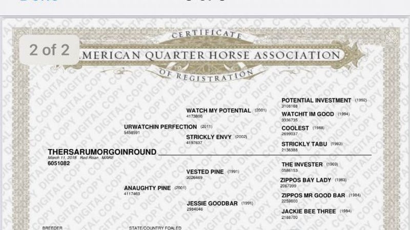 SUBASTA EN LÍNEA Realice sus pujas en www.PlatinumEquineAuction.com Oferta inicial $3500 La subasta finaliza el 1 de septiembre de 2024 ¿Necesita una silla nueva? ¡Echa un vistazo a White Rock Saddles en nuestro sitio web o Facebook! Ally ThersARumorGoingRound... Prepárate para enamorarte de Ally. Ella tiene la parte más importante del caballo ( una gran mente ). Ally es asombrosa hermosa y conformación correcta. Ally es un AQHA 6 años de edad 15,1 manos yegua en busca de su próximo socio. Ella tiene algunas grandes líneas de sangre en su pedigrí. Su conformación hermosa la coloca constantemente en la parte superior de las clases de halter y ella es una estrella de rock en showmanship. Es muy fácil de mantener y sus modales en el suelo son excelentes. Ally esta domada con un gran paso lento, trote y galope. Ally es equilibrada en las tres puertas y tiene una parada fácil. Responde muy bien a las indicaciones de la pierna / rienda y entrenado con una parada de la espuela y la copia de seguridad. Ally ha estado con un entrenador durante unos años en la formación placer occidental y ella es increíble. Ella puede ser mostrado en el oeste o Inglés le encanta. Ella no se ha demostrado en serio en el último par de años. Afortunadamente, ella parece recoger la derecha donde lo dejó, incluso con grandes pausas en la equitación. Desde que estamos aquí, Ally ha probado cosas nuevas con gran éxito. La hemos montado por senderos y lo ha hecho muy bien, ha salido a ver la vida salvaje y lo ha disfrutado, ha subido y bajado muchas colinas y ha atravesado agua y maleza. Le hemos mostrado obstáculos puentes, neumáticos, fideos de la piscina de lavado de coches y ella ha dominado todo con facilidad. Esta yegua podría entrar en el anillo de la demostración o ser caballo de rastro de lujo de alguien con todos sus botones. Ella es absolutamente suave para manejar amable, paciente y fácil de virar, ella clips, lazos y baños con facilidad. Ally es fácil de transportar y es muy tranquilo en nuevos entornos. No tiene ningún mal hábito. Podría escribir un libro sobre esta yegua fantástica que es simplemente increíble. Por favor, póngase en contacto con Longhorn Ranch Dina 831-537-1915 ubicado en Paicines, CA. SUBASTA EN LÍNEA Coloque sus ofertas en www.PlatinumEquineAuction.com Oferta inicial $ 3500 La subasta termina el 1 de septiembre de 2024 ¿Necesita una nueva silla de montar? ¡Echa un vistazo a White Rock Saddles en nuestro sitio web o Facebook!