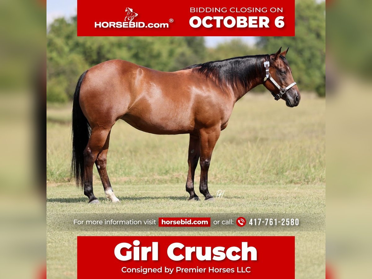 🍂 𝓐𝓾𝓽𝓾𝓶𝓷 𝑨𝑳𝑳 𝑺𝑻𝑨𝑹 𝑳𝑰𝑵𝑬𝑼𝑷 🍂 Happening now thru MONDAY | OCTOBER 6th - Available EXCLUSIVELY on HorseBid's website! For more details and to register visit: www.Horsebid.com CONSIGNOR CONTACT: Premier Horses LLC 417-761-2580 LOCATION: Buffalo, Missouri BREED: Quarter Horse REGISTERED: Yes REGISTERED NAME: Girl Crusch COLOR: Bay HEIGHT: 14.2 AGE: 8 GENDER: Mare Wow.. talk about a mare! There is not one thing we would change about … She is an absolute showstopper and movie star quality, oh wait that’s right she already is! Crush has appeared on RFD-TV for Women’s Pro Rodeo Today a handful of times, that alone lets you know how special she is. She has an extremely kind eye and has the best disposition you could ask for. Crush is a beautiful bay with a long black mane and tail paired with a baby doll head and flawless conformation. She has a stacked cowbred pedigree. She is sired by the NCHA $1.5 million dollar sire, Dual R Smokin and out of Hickory Choice who is by NCHA $5 million dollar sire SR Instant Choice. Hickory Choice has offspring earnings of $289,000+ as well. Talk about a one of a kind mare! Crush rides around the very best and will even tote around the littles. Our daughter rides her around bareback, putting with all the shenanigans and so patient. She trots and lopes the prettiest circles you ever saw. Solid stop, backs, turnaround, and moves well off your leg. She is so much fun to ride that you never want to get off of her and if you watch the video, it’s easy to see why. She checks so many boxes pedigree, conformation, ride-ability, and even experience outside of the movie set and arenas. Crush is super solid on the trails and goes down them with confidence. She goes on any type of terrain like a pro, never batting eye. She rides down the creek beds, goes through water, and traffic safe. Crush goes over and the obstacles surefooted and enjoys it. She has had one foal and is breeding sound.