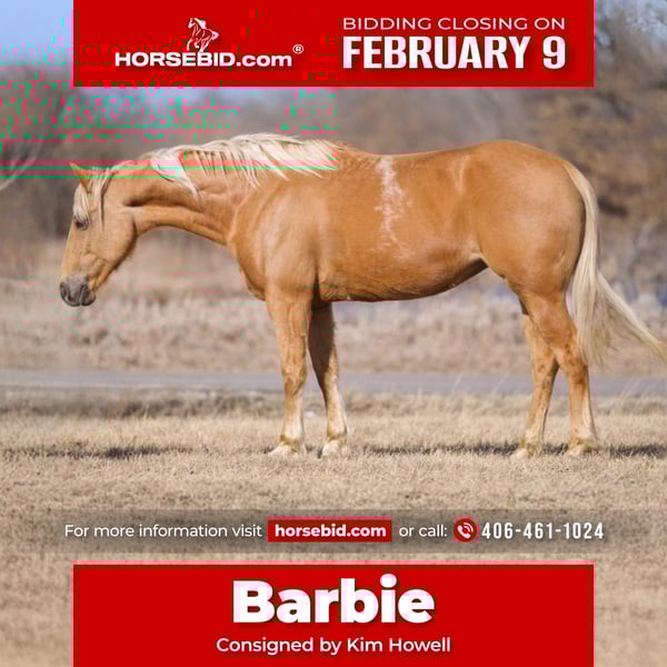 ❤️🔥𝑩𝒆 𝑴𝒊𝒏𝒆 𝐒𝐄𝐋𝐄𝐂𝐓❤️🔥 Happening now thru MONDAY | FEBRUARY 9th - Available EXCLUSIVELY on HorseBid's website! For more details and to register visit: www.Horsebid.com CONSIGNOR CONTACT: Kim Howell 406-461-1024 LOCATION: Camp Verde, AZ BREED: Quarter horse REGISTERED: No REGISTERED NAME: Barbie COLOR: Palomino HEIGHT: 14.3 AGE: 9 GENDER: Mare She’s got the beauty, she’s got the brains. She’s a working gal with an extensive resume, and a willing personality that’s sure to take you far. Not to mention she also happens to be the perfect shade of BLONDE! “Barbie” is the whole package, and a favorite amongst almost everyone she meets! No matter of it’s at an event, down the trail, or on a job; this gal continually proves to be trusty. Barbie is a 10 year old gorgeous Palomino mare standing at a perfect 14.3 hands tall. She is a finished and HONEST barrel horse. Barbie run right or left in just about any pen or environment with no fuss. She’s super automatic and gives the same run and level of try every time! Barbie is also YOUTH and novice suitable and is so fun and forgiving to run and ride in general. Barbie has a nice one hand neck rein, walk, jog, trot, lope both ways with ease and a nice comfortable stop anyone can get a long with! Both in the arena and outside she’s is confident and brave and takes great care of her rider. When on the trails she is very sure footed and cognizant of her surroundings. She isn’t spooky or buddy/barn sour. She crosses anything you’d like and is happy to go out on her own or in a group! My favorite thing about this mare is the fact she is ALWAYS looking for the right answer. From working cattle, to rodeos, chuckwagon races, jackpots, cruising downtown, or just hanging out at the arena with some friends. She is happy and willing to do anything that’s asked of her, which makes her so enjoyable to be around! Not only is she a blast to ride, Barbie is also extremely well mannered on the ground. She is the epitome of what it means to be GENTLE. She stands great for the farrier, leads, loads in anything, and is super easy to handle, bathe & care for. She has absolutely zero buck, bite, or kick and will still be the same horse after time off! If you are looking for a versatile horse you can go run a pretty set of barrels, chase wild cattle on, or just enjoy on a leisurely trail ride. Here she is! I have full confidence this mare will be loved and adored no matter where she is. I have spent many hours and miles with her and I am so excited to offer her! Come meet her you will come to know and love her just as I have. Feel free to call or text me for any further questions you may have, or to come meet this absolute sweet heart of a mare! Thank you so much for looking, and God Bless! (406) 461-1024