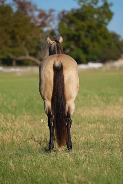 🎄𝐓𝐇𝐄 𝑯𝒐𝒍𝒊𝒅𝒂𝒚 𝐂𝐋𝐀𝐒𝐒𝐈𝐂🎄 Happening now thru MONDAY | DECEMBER 15th - Available EXCLUSIVELY on HorseBid's website! For more details and to register visit: www.Horsebid.com CONSIGNOR CONTACT: LB Equine Sales, LLC 214-449-8028 LOCATION: Terrell, TX BREED: AQHA REGISTERED: Yes REGISTERED NAME: Hook Line and Sinker COLOR: Buckskin HEIGHT: 15.2 AGE: 8 GENDER: Mare Hello, gorgeous! Sylvie is here to sprinkle holiday magic your way! This dreamy dappled buckskin mare is picture-perfect — think Barbie elegance with real-world rideability (and comfort -no less). Her kind baby doll face draws you straight in and stops you right in your tracks—substance, poise, presence, a kind eye, and effortless beauty all in one complete package. Channeling all the old lady energy right over here– (she requests: cookies, peppermints, shoulder/belly scratches, and the full princess treatment!!). By ‘VS Flatline’ and out of a foundation mare, this 15.2H, 2017, AQHA registered mare is the type that never goes out of style! By VS Flatline, a Million Dollar sire himself, 5x All American Quarter Horse Congress Champion, AQHA World Champion, NSBA World Champion! Sylvie floats across the ground, is fancy-broke, and gentle as they come. Comfortable, easy, predictable, and fun to ride – Sylvie can go western and english. She has a lovely pitter patter jog and will step up into a ground covering extended trot. Her canter is LOVELY – like riding in the world’s softest rocking chair. Sylvie will take care of her rider. She is light, soft, and responsive in her aids. She loves to work for you and is a huge people pleaser. She has been used for basic ranch chores AND has been lightly pasture roped off of! She walks right through the water confidently, crosses bridges, great with traffic/cars weaving around her, good with dogs, and has been used on cattle a bit. Sylvie has never offered to buck, rear, or bolt. Stands great for the farrier, cross ties, clips, easy to catch, loads/backs out, not quirky or stand off-ish on the ground, she is right in your pocket and ADORES attention/scratches/grooming. Sylvie is kind and is not “mare-ish” or sassy which I appreciate in a mare. She has been taken on numerous trail rides and been shown at the local ranch riding series. Ride her, breed her, or do both- she is a solid investment! You are guaranteed to own one of the prettiest mares in the barn. 100% sound, no maintenance, no vices, never injected, zero navicular or feet issues! Sylvie is an easy keeper and happy to be up in the barn (corner pooper) or turned out with friends. Sylvie has a recent PPE on file – with a full set of x rays ready to send for your vet to review. Current coggins, recently dewormed, vaccinated, and teeth floated in November by an equine dentist. All records meticulously kept on this mare. AQHA/ NSBA papers and bill of sale paperwork is in order, ready to transfer, and will be signed between buyer and seller at the end of the sale. Wears a size 78-80” blanket and is slick coated, she has been under lights since September. She is 5 panel negative per her papers. Shipping available nation-wide.