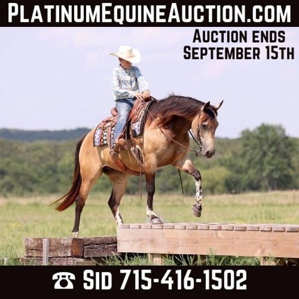 ONLINE AUCTION Place your bids at www.PlatinumEquineAuction.com Starting Bid $3500 Auction ends September 15th, 2024 Need a new saddle? Check out White Rock Saddles on our website or Facebook! This mare is so special! Miss Hollywood lives up to her name with all her glamour! She’s a 14.2h, 2017 model, registered APHA buckskin tobiano mare with all the chrome you could want, and a personality to match. She is more than just a pretty face though. She is the SMOOTHEST horse you’ll ever ride. Hollywood has been ridden all over the ranch, on trails, through ponds and over bridges. She’ll drag tarps and logs, or any obstacle you might need to move. She’s happy to go to work every day and is an easy-going, laid back mare who is willing to please riders of all levels. Not only does Hollywood have just about every button installed, she also knows some fun tricks you can show off. She’ll lie down on cue and will also side pass to any mounting block, fence, or tree stump, etc if you need to climb on easily. You can ride her bareback and in a halter if you want to take her out for a leisure stroll when the weather’s nice. There’s literally nothing like having that bond with a horse you can trust. Miss Hollywood knows all the important stuff too. She will circle both directions. Steers easily! Stops and backs up light as a feather. Her gaits are comfortable balanced. She has a great side pass and spin. We’re very proud of this mare and all she has to offer. She’s 100% sound. Radiographs available. No vices. Stands politely for the farrier. Loads and ties with no issues. Super easy to catch in a field. She’s comfortable being stalled or turned out! Don’t miss out on this gem of a mare! Call Zacharias Horsemanship Sid 715-416-1502 with any questions. Located in Adair, OK. ONLINE AUCTION Place your bids at www.PlatinumEquineAuction.com Starting Bid $3500 Auction ends September 15th, 2024 Need a new saddle? Check out White Rock Saddles on our website or Facebook!