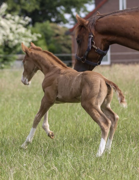 Cole — jego piękny kolor, niebieskie oko oraz uroczy wygląd sprawiają, że jest prawdziwą ozdobą. Urodził się w 2025 roku i osiągnie przewidywaną końcową wysokość około 150 cm. Cole to kompaktowy, mocny i dobrze umięśniony ogier Quarter Horse. Jego solidna budowa, zdrowie oraz przyjazny, chętny do kontaktu charakter przemawiają na jego korzyść. Cole jest dobrze zsocjalizowany, zna się z weterynarzem i kowalem, dorasta w małej grupie klaczy i źrebiąt. Jego spokojny temperament, chęć do nauki i otwartość sprawiają, że jest łatwy w obsłudze i bardzo przyjemny w kontakcie. Dzięki znakomitemu pochodzeniu reiningowemu jest idealny do sportu, na zawody lub rekreację. Cole prezentuje imponujące ruchy i ma potencjał, by stać się prawdziwie atletycznym koniem. Jako kandydat na ogiera, chętnie trafi w ręce hodowcy, ale również wyżej postawieni jeźdźcy rekreacyjni mogą być z niego zadowoleni. Kliniczna ocena stanu zdrowia zostanie wykonana przez hodowczynię w ramach sprzedaży.