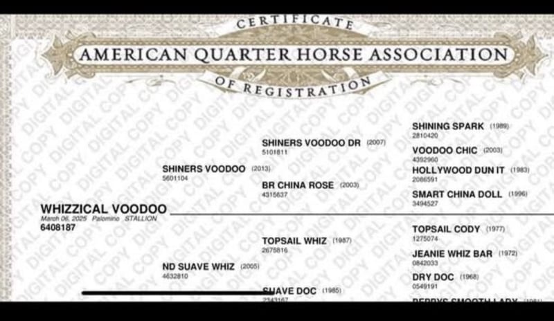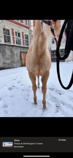 Zum Verkauf steht unser junger AQHA-Hengst WHIZZICAL VOODOO, genannt Whizzi. Geboren am 06.03.2025, in attraktiver Palomino-Farbe, gezogen in Deutschland. Whizzi ist ein Sohn von SHINERS VOODOO und bringt damit beste Voraussetzungen für eine sportliche Zukunft im Reining- oder Cowhorse-Bereich mit. Er zeigt sich korrekt gebaut, bewegungsstark und aufmerksam, dabei im täglichen Umgang sehr lieb, freundlich und unkompliziert. Ein netter junger Hengst mit angenehmem Charakter und viel Potenzial für die weitere Ausbildung. Kurzinfos: • AQHA Hengst, Palomino • Geboren: 06.03.2025 • Sohn von Shiners Voodoo • AQHA Reg.-Nr.: 6408187 • Microchip vorhanden • Abzeichen: Stern, Blesse & Schnippe, Socken an den Hinterbeinen • Standort: Deutschland • AQHA-Papiere vorhanden Geimpft entwurmt & nrha eingezahlt Ein spannendes Nachwuchspferd mit sportlichem Background und tollem Wesen. Preis: VB Weitere Infos, Fotos oder Videos gerne auf Anfrage Platz vor preis