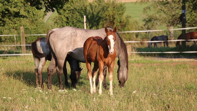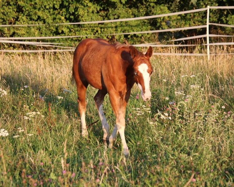 BE Diamonds Gunshine - dieser Eyecatcher, 4.25 geboren mit einem geschätzten Endmaß von 148 -153 cm, beeindruckt nicht nur mit seiner tollen Zeichnung, sondern auch mit seinem Charakter, seinem Körperbau und seiner Abstammung. Grays Starlight, Shining Spark, Peppy San Badger und Lil Ruf Peppy, diese erfolgreichen QH Hengste der Reining Zucht findet man in seinem Papier. Diamonds Vater, Walla Walla Gunshine, wurde sehr erfolgreich geshowt (LTE: 20.000 $). Der Jährling besitzt einen verschmusten, coolen Charakter. Ist sportlich unterwegs und weiß sich zu bewegen. Der Hengst ist harmonisch gebaut mit ausgewogener Bemuskelung und korrektem Körperbau. Er hat ein blaues und ein braunes Auge. Diamond wächst artgerecht mit gleichaltrigen Jungpferden auf und kennt das Fohlen ABC. Top Nachwuchspferd mit einem Charakter aus Gold. Ins EWU Jungpferdeprogramm einbezahlt.