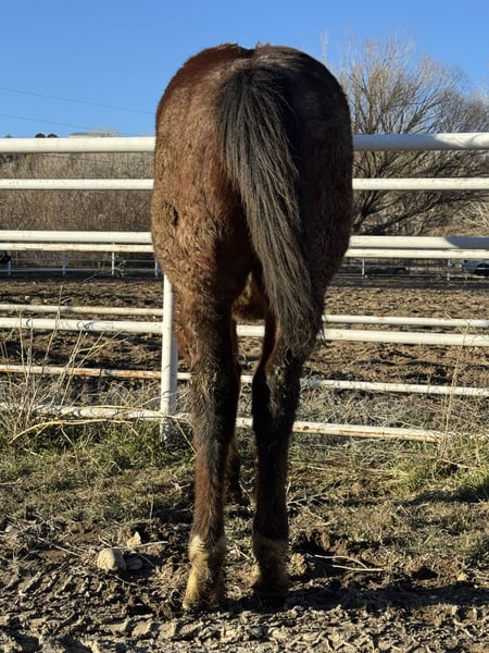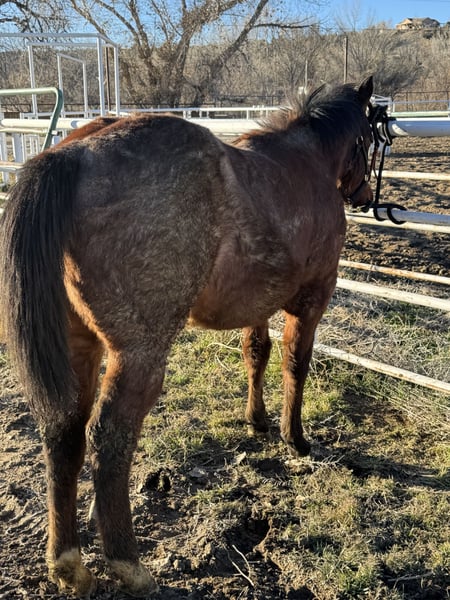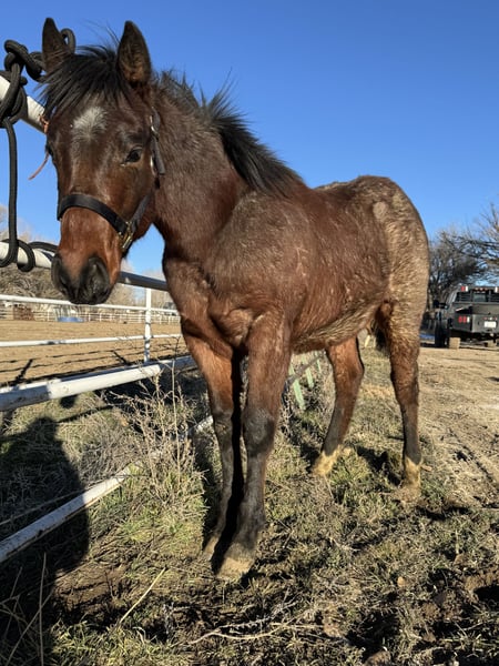 GS One Time Moon 2025 Bay Roan Colt This kid is thick and will be a showstopper. He should mature to 15hh and will be a wide guy. He is UTD on vaccines and worming. He is intact as he is not quite a year old. He will make an incredible stud prospect. He was born with an umbilical hernia that we had surgically corrected, we have been told that will not affect him. He will stand tied and trailer (he takes his time). Contact with any questions.
