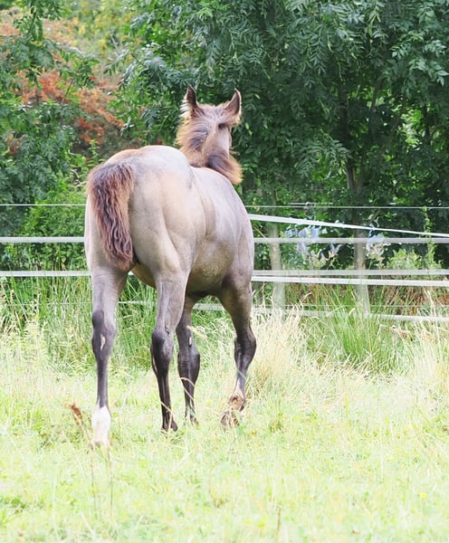Stallion foal 05.2025 by MJM Saltys Blue Ezra, out of Champagne Pearl in Buckskin Roan. With an athletic build and a very loving nature, he is looking for a 5-star home where such a wonderful boy will be appreciated. He is sure to become a reliable partner for his rider, providing a lot of joy.