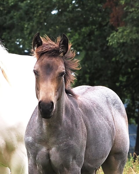 Potro macho 05.2025 de MJM Saltys Blue Ezra, de la Champagne Pearl en Bukskin Roan. Con una construcción corporal atlética y un carácter muy amable, está buscando un hogar de 5 estrellas donde se aprecie a un chico tan maravilloso. Seguramente será un compañero confiable para su jinete, que brindará mucha diversión.