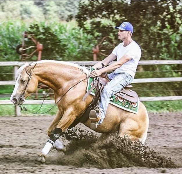 Rw Magnetic Whiz (Reinart) is now 18 months old and is a beautiful perlino with lovely white feet and blue eyes, a gorgeous athletic stallion with superb bloodlines for reining. He has a very calm and cool temperament, is not easily impressed, can be loaded into a trailer, and can be handled by hand. He is very well-trained and has no stallion behavior whatsoever. He is also very well-behaved with other horses. He has been fully vaccinated and dewormed and has always been to the farrier on time. The last two photos are of his sire and dam. He is a very nice sport horse with a promising future in reining.