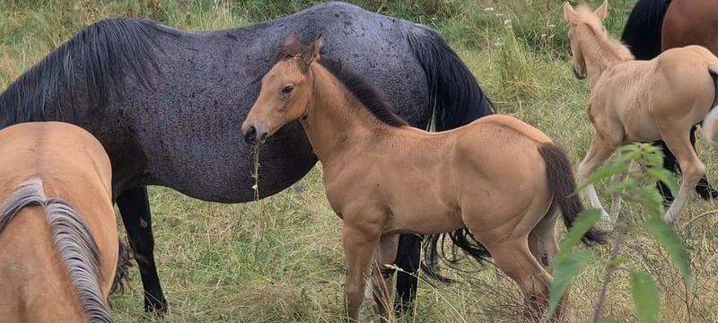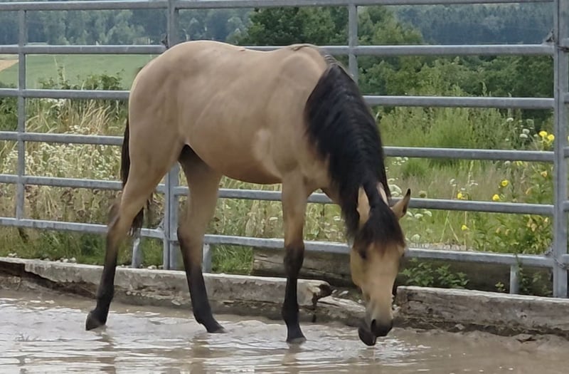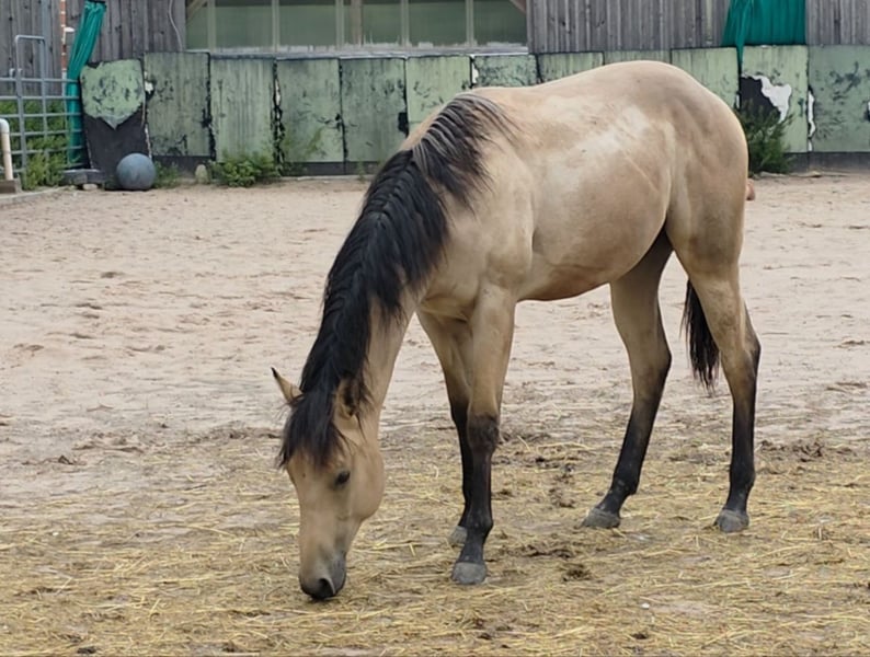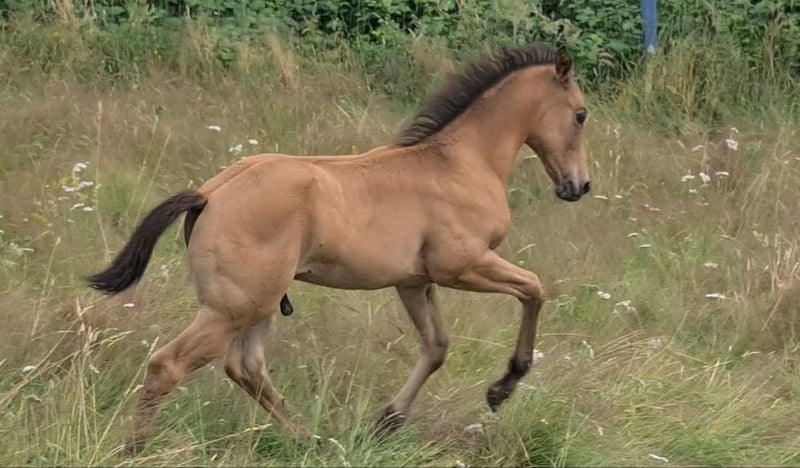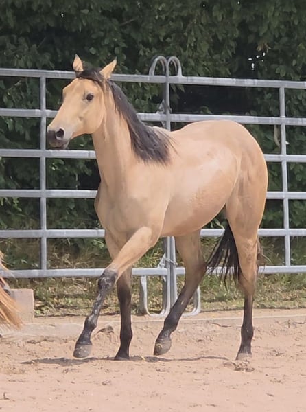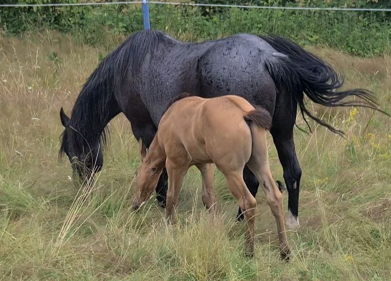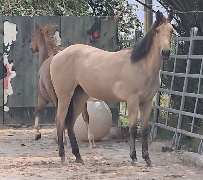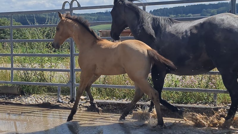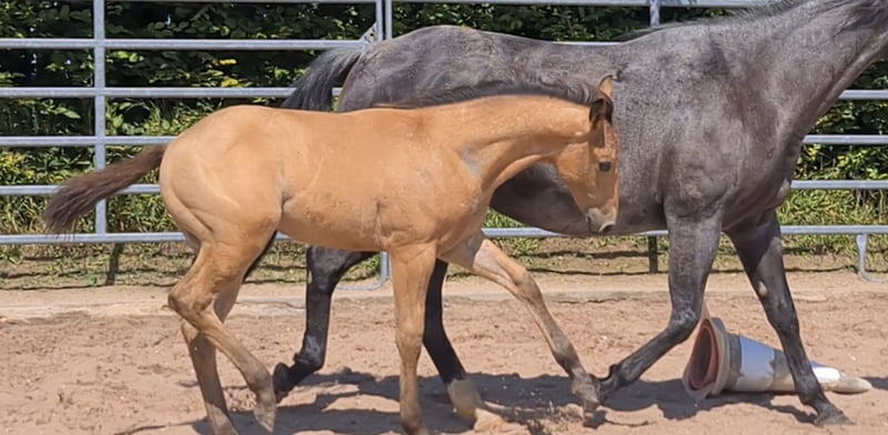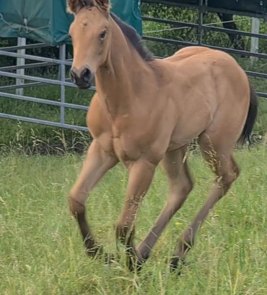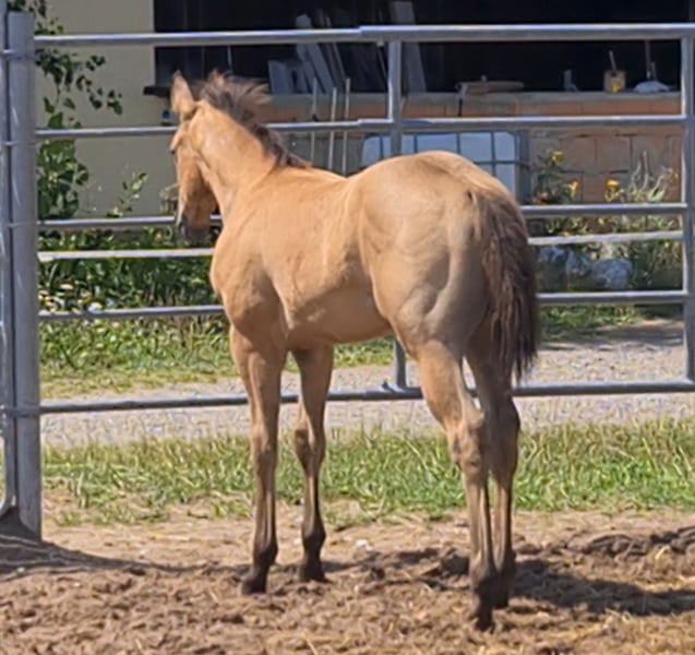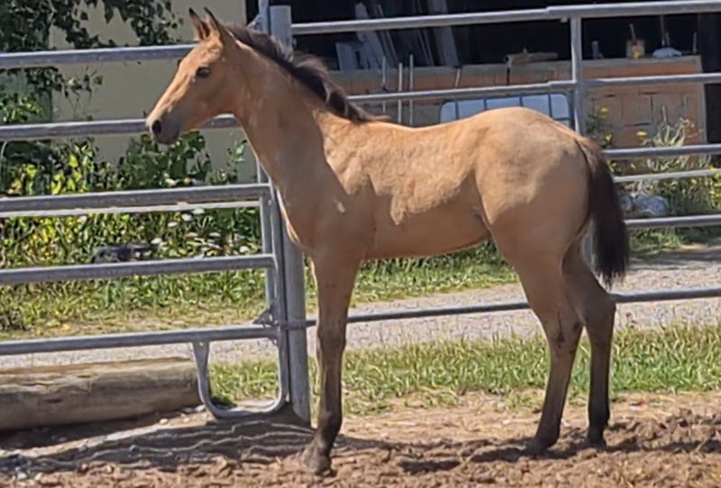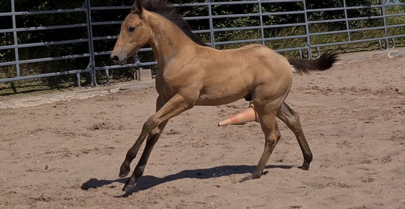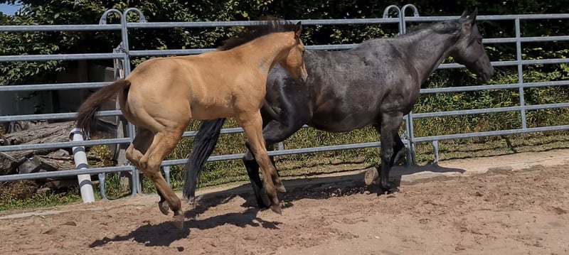 **HES Holywood Hancock** Buckskin colored American Quarter Horse stallion foal *09.05. 2024 estimated height:** 153 cm Western Ranch Horse Classes / Reining / Breeding We are offering a promising American Quarter Horse colt for sale. This young Buckskin stallion, born on 09.05.2024, impresses with his incomparable charisma, conformation and talent for movement. He is already incredibly muscled after just one month, which probably comes from his mother. He also shines with great, strong joints and a stable and correct foundation, measuring 153 cm and excellently suited for western riding. He not only impresses with his eye-catching color, but also with his friendly nature and willingness to learn. This stallion has the potential to become an outstanding partner in western riding and brings with him the best characteristics of his breed. If you are interested or have any further questions, we look forward to hearing from you!