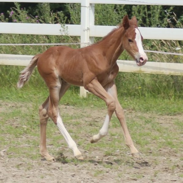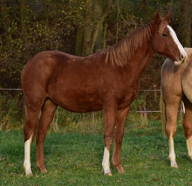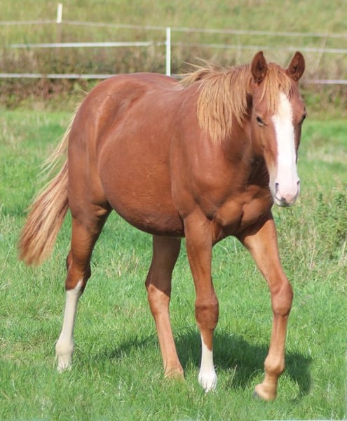 Occasion !! Superbe poulain hongre de race Quarter Horse couleur alezan, issu des meilleures lignées de Reining. Réserve champion lors de l'exposition de la DQHA avec 83,32 % !! La mère est une fille de Gunnatrashya, issue d'une fille de Docs Hickory, qui a déjà produit un champion de la limited Open Futurity. Le père est lui-même montré avec succès et est un fils de Shine Chic Shine, issu d'une fille de Wimpys Little Step. Un pedigree qui ne laisse rien à désirer ! Le petit est bien construit, avec des mouvements athlétiques et fluides, il change de pied avec une grande facilité. Venez le voir, ça vaut le coup !!