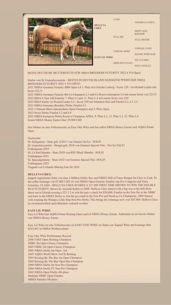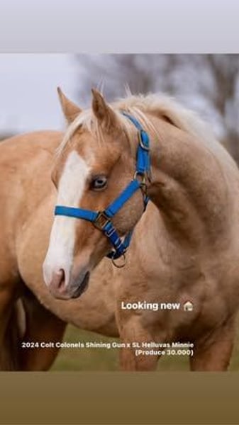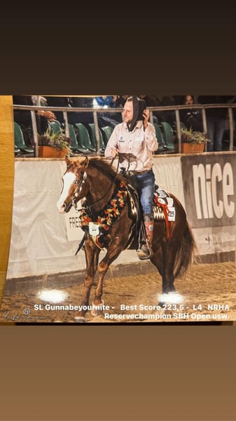 6-Panel N/N getestet, NRHA Germany und Eurofuturity nominiert - noch nicht angeritten - geboren 1.5.2024 Palomino Hengst mit 2 blauen Augen Seine Mutter ist SL Helluvas Minnie: BESTE DEUTSCHE MUTTERSTUTE FÜR NRHA BREEDERS FUTURITY 2022 4 YO Open! Mutter von NRHA PE 30.000 USD + Mutter von SL Gunnabeyournite - BESTES IN DEUTSCHLAND GEZOGENE PFERD DER NRHA BREEDERS FUTURITY 2022 4 YO OPEN!: 2021 NRHA Germany Futurity SBH Open L4 3. Platz mit Grischa Ludwig - Score 220 - Go-Round Leader mit Score 222,5! 2022 NRHA Germany Futurity Bit Co-Champion L3 und Co-Reservechampion L4 mit einem Score von 223,5! 2022 IRHA 4 Year Old Futurity 7. Platz L3 und 12. Platz L 4 mit einem Score von 220! 2023 IRHA Derby Go Round Leader L2 - Score 220 mit Johannes Heil und Finalist L2, L3, L4 2023 NRHA Germany Breeders Derby Finalist L2 2023 3 Nations Show Intermediate Open Champion und 5. Platz Open 2023 Swiss Derby Finalist L2 und L4 2023 NRHA European Derby Reserve Champion APHA, 9. Platz L2, 15. Platz L3, 22. Platz L4 Somit NRHA Money Earner über 29.000 USD Ihre Mutter ist eine Vollschwester zu Easy Otie Whiz und hat selbst NRHA Money Earner und AQHA Points Open Vater ist der Top Reiningvererber Colonels Shining Gun