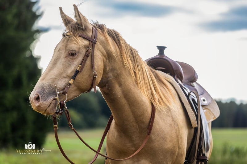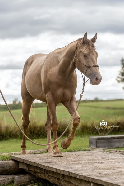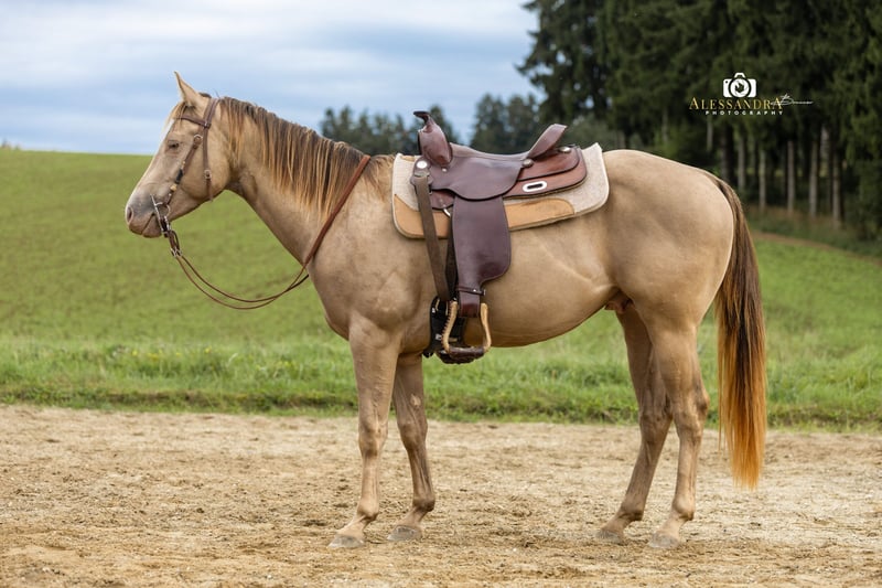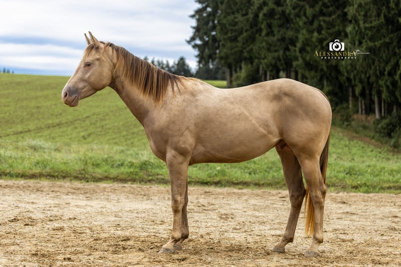 On behalf of the customer: Infinit Moonshine RR… …is a super stylish American Quarter Horse stallion in the rare special color "Classic Champagne," who has won fans with his excellent manners and curious, lively character. He comes from the Czech Republic directly from his breeder, where he was raised under the best conditions in a herd environment. At 7 months old, he came to Germany to his current owner, who can have him professionally backed upon request. At his age, Infinit has been very well worked from the ground and is already excellently prepared for being backed. He is familiar with the saddle and bridle, as well as leading with a rider, and has been lunged in all three basic gaits. He joyfully and confidently tackles the in-house extreme trail obstacles. He has been taken on several rides as a companion horse, but he also confidently goes out alone into the terrain. If you are looking for a self-assured and exceptionally strong-minded horse for ambitious leisure or competition sports, you have found the right one! Currently, Infinit is in a gender-segregated mixed-age herd, but he is also familiar with box housing with a paddock and daily turnout. Of course, he has been regularly dewormed and has seen the farrier (barefoot) and is up to date with vaccinations for competitions. He is tested 6 Panel N/N through his parents. He naturally has full AQHA papers, making him interesting for breeding. His pedigree includes foundation lines and top sires like "Hello Shiner." If you have a horse that you would like to sell, please feel free to contact us. We buy, take in trade, or market your horse for you until the final sale. More information at www.wow-pferd.de