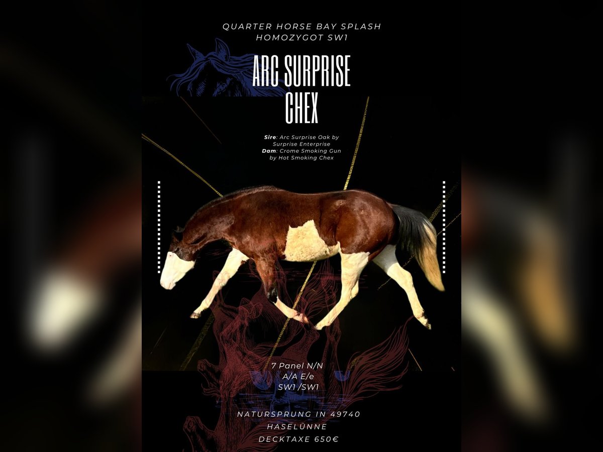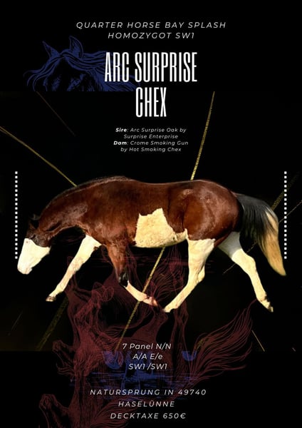 ARC Surprise Chex ist ein toller Reining gezogener Hengst. Homozygot Splash und 7 Panel n/n. Kein Gunner-Blut. Hört 100% Natursprung in 49740 Haselünne.