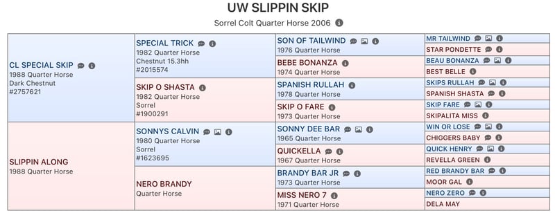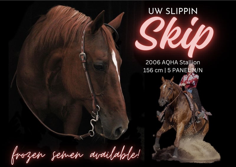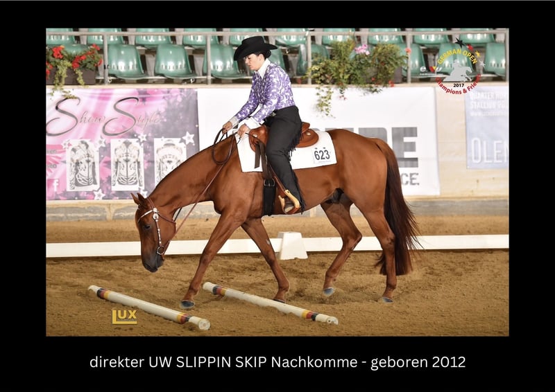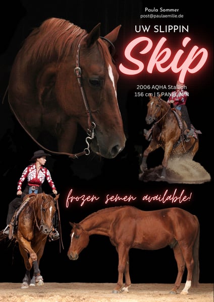 UW Slippin Skip ist ein Quarter Horse, der sowohl mit seinem stimmigen Exterieur als auch supercoolem Interieur punkten kann. Er überzeugt durch seinen stabilen und athletischen Körperbau sowie seiner Leistungsbereitschaft und Verlässlichkeit. Diese Eigenschaften sorgten für zahlreiche Erfolge im Sport. Dazu zählen unter anderem: 2010 Landesmeister Western Horsemanship & Landesmeister Jungpferde Reining 2010 Bestes Jungpferd auf der GO 2010 (Reserve Champion Jungpferde Basis, Reserve Champion Trail & 4. Jungpferde Reining) 2011 Landesmeister Western Horsemanship, Landesmeister Jungpferde Basis & Landesmeister Jungpferde Trail (… sowie Vizelandesmeister in diversen weiteren Klassen) 2011 mehrfacher GO Finalist und Platzierungen, Reserve Champion Jungpferde Basis Er wurde mit der silbernen Pferdemedaille in Western Horsemanship und bronzenen Pferdemedaille in Reining ausgezeichnet. UW Slippin Skip hat seine Qualität als Vererber bereits mehrmals unter Beweis gestellt. Seine Nachkommen sind mehrfache Landesmeister und erfolgreiche German Open Finalisten. 5 Panel N/N Decktaxe 2026: 500€ Kontakt: Paula Sommer post@paulaemilie.de 0172 3444848