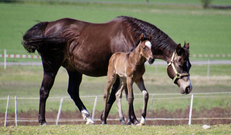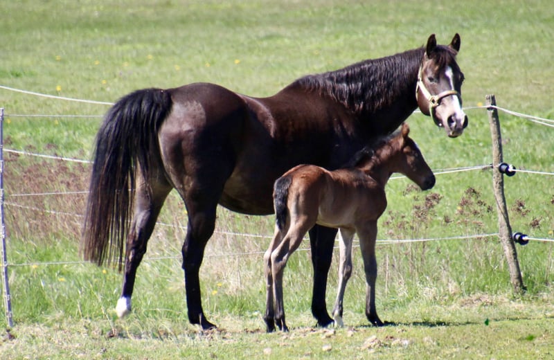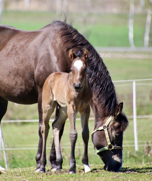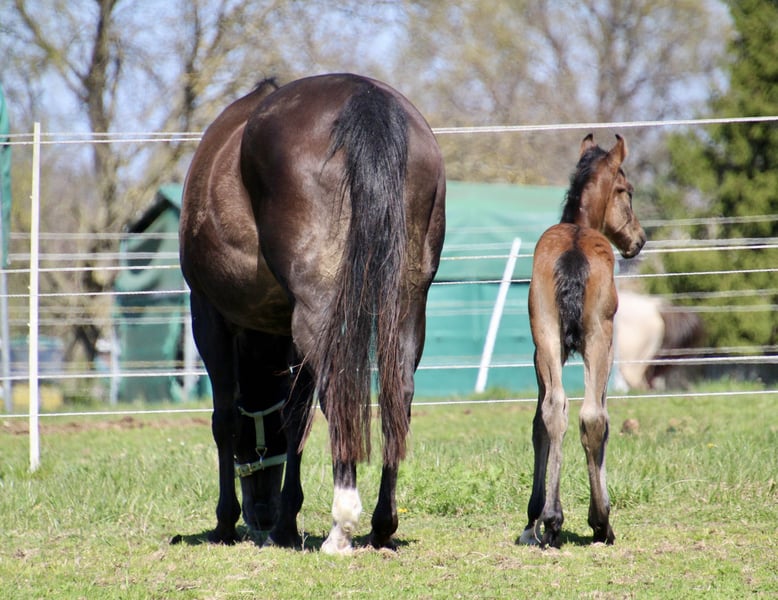 Sire: MJM Saltys Blue Ezra Dam: PR Diabolos Diamond Am 10.04.2026 ist dieses wunderschöne Hengstfohlen in bay roan geboren! „Salty“ überzeugt durch sein hervorragendes Gebäude…er hat ein starkes Fundament und eine schön definierte Muskulatur! Charakterlich ist er sehr aufgeschlossen und im Moment klebt er noch gut an Mamas Seite Er hat bereits die Koppeltage in der Sonne gießen dürfen und wächst im Herdenverband mit weiteren Fohlen auf! Durch sein Pedigree ist er ein echter Juwel für Foundation Fans…sein eigentlicher Anteil wird derzeit berechnet. Bei Interesse erzähle ich gern persönlich mehr über den jungen Mann! Ratenzahlung möglich Die letzten Bilder zeigen den Papa