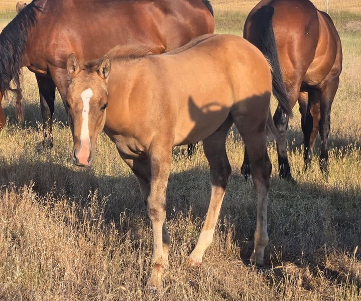 Super good red dun with a dark chestnut mane and tail with a light red dun body, which is very very striking. In addition to his really cool color, this guy is an awesome stout cow horse. His hip goes on forever and his body is deep and stout. He is out of my favorite mare that has produced tremendous horses. “Tonka” is a keeper!