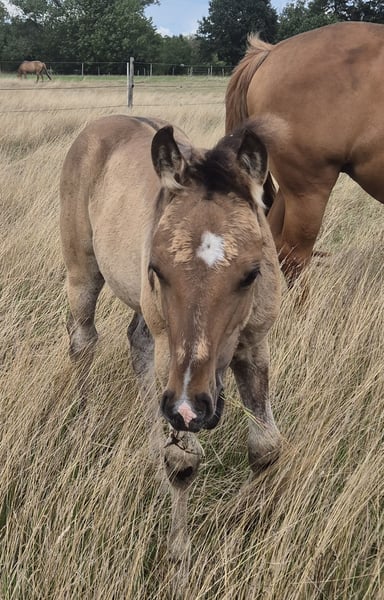 **Annonce de vente : Poulain American Quarter Horse, étalon** Spotlight Charly x HF Mobster (par Gunner) À vendre, un prometteur poulain étalon American Quarter Horse né en mai 2025. Le père est l'étalon exceptionnel Spotlight Charly (www.spotlightcharly.de), la mère est une fille directe de HF Mobster. Avec sa couleur frappante, son corps extrêmement correct et son caractère charmant et engageant, il est un véritable attrait et promet d'être un partenaire extrêmement talentueux pour le sport équestre de haut niveau. "Rocher" grandit dans un environnement adapté et affectueux en petit troupeau et est manipulé et travaillé quotidiennement. Il est régulièrement vermifugé et sera présenté au maréchal-ferrant, connaît les bases de l'éducation des poulains et sera chargé de manière calme au moment de la vente, ayant également été monté en tant que cheval de main. Nous procéderons également à la première vaccination ainsi qu'à un dépôt dans le programme des jeunes chevaux de l'EWU. Pour toute question ou pour plus d'informations, je suis à votre disposition. Lors de votre visite, vous pourrez voir les deux parents ainsi que des demi-frères et sœurs et éventuellement les essayer. Un poulain femelle ainsi qu'un yearling, peut-être aussi l'un de mes chevaux montés plus âgés, sont également à vendre.