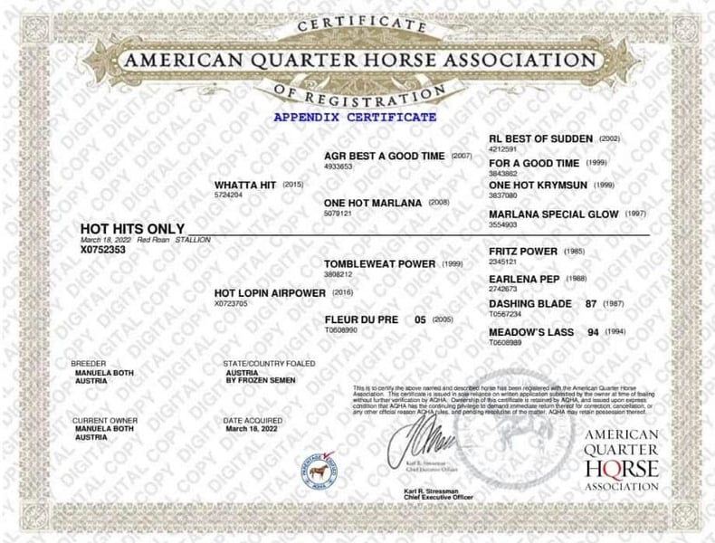 AQHA Pleasure / All Around Hengstfohlen sucht ab September 2026 ein liebevolles Zuhause Geboren 02/2026 - aktuell Sorrel - könnte auch Chestnut oder Red Roan werden Bei der Abgabe hat er einen 6 Panel Test, ein AQHA Papier, einen Equidenpass, ist gechipt, geimpft und mehrfach entwurmt! Er hat eine weiße Unterlippe - eventuell wäre eine Doppeltregistriert möglich. Absoluter Eyecatcher. Wir groß - vermutlich 1,60 - 1,65 (seine beiden Vollbrüder sind mit 3 und 4 Jahren schon knapp 1,60) Gerade Beine, kurzer Rücken, tolles Exterieur, mega Beweger, sehr neugieriges und offenes Wesen! Mutter: Hot Lopin Airpower - Stockmaß: 1,60-1,62 - 4 Panel n/n - n/HRD Vater: Whatta Hit - Stockmaß: 1,60 - 5 Panel n/n - IMM n/n - OLWS n/n - EJSCA n/n Showerfolge Whatta Hit Multiple Austrian Champion Multiple Futurity Champion Multiple Grand- & Reserve Champion Multiple World Show Qualifier Multiple Year End High Point Horse ROM Showerfolge Whatta Hit Nachkommen HONOR Roll Champions European Champions Reserve European Champions German Champions Slovakia Champion Dutch Champion Czech Champion Austrian Champions Reserve Austrian Champions Futurity Champions Reserve Futurity Champions Grand & Reserve Grand Champions Year End High Point Horse Showerfolge der Vollbrüder (Hot Hits Only und Whatta Hot Hot Loper) Mehrfache Klassen Sieger Mehrfache Österreichische Meister Mehrfache Futurity Champions Mehrfache Grand- and Reserve Grand Champion Year End High Point Horse World Show Qualifier Die beiden Vollbrüder wurden als Flaschenkinder großgezogen und stehen daher NICHT ZUM VERKAUF Beide Elternteile, sowie seine beiden Vollbrüder und 2 Halbgeschwister sind ebenfalls direkt vor Ort zu besichtigen Preis bis zum absetzen: €7.500.- Achtung! Wir bieten KEINE Fohlenaufzucht oder Einstellplätze an Weitere Fotos und Videos gerne WhatsApp, jedoch nur bei ernsthaften Interesse! Standort: 7033 Pöttsching/ Österreich
