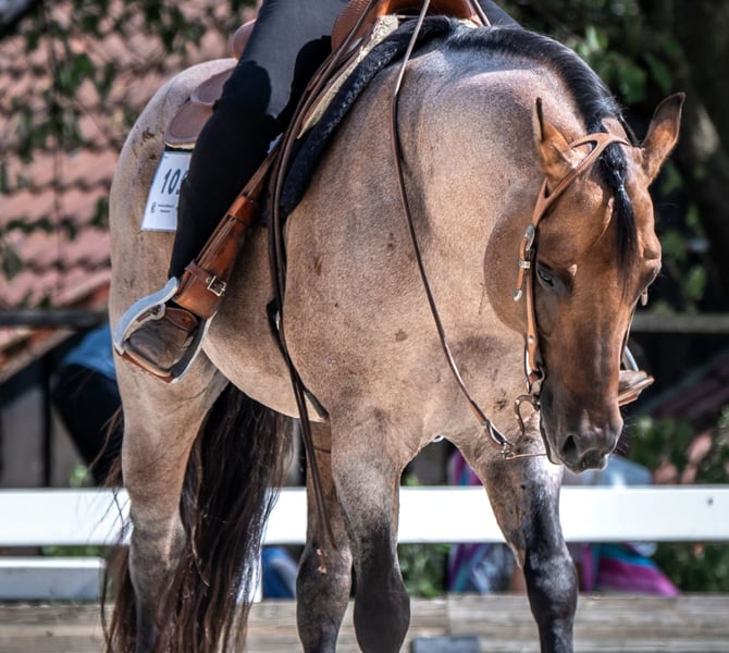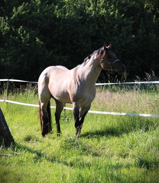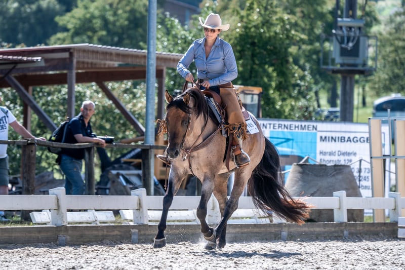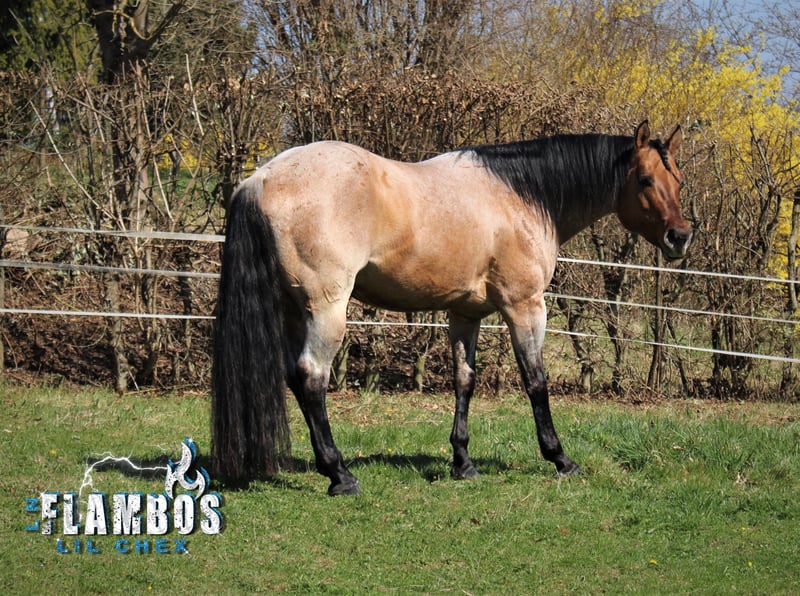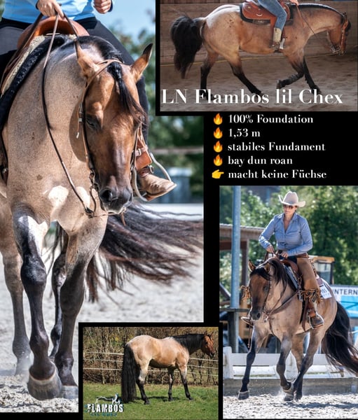 LN FLAMBOS LIL CHEX stammt aus altbewährten Ranch Horse und Reining Linien mit einem Foundation-Anteil von 100% (FQHA). Er ist mit einem hervorragenden Gangwerk ausgestattet und hat einen traumhaften Charakter. "Willi" ist ein absoluter Eyecatcher und sticht aus der Menge heraus. Sein wundervolles Köpfchen rundet die Sonderlackierung und den harmonischen Körperbau ab. Er hat schwarze feste große Hufe, stabile Gelenke und Beine, einen weit in den Rücken ragenden Widerrist, eine tolle Oberlinie und eine super Bemuskelung. Charakterlich überzeugt er durch Nervenstärke, Freundlichkeit und durch seine Liebenswürdigkeit. Er kann in der Herde gehalten werden und ist absolut klar im Kopf. Egal wo er auftaucht, er ist Jedermanns Liebling. Er konnte auch schon erste Turniererfahrung sammeln und schnitt hier sehr gut ab. Seine Spezialitäten sind Ranch Klassen, aber auch in der Reining und im Trail zeigt er sich von einer guten Seite. Seine Nachzucht ist absolut überzeugend und es sind bisher nur Sonderfarben gefallen. Willi kann keine Füchse machen. Es fallen tolle Farben. Eckdaten: # 1,53 m Stockmaß # 5 Panel n/n + IMM/MYH1 n/n # Bay Dun Roan ( EE - Aa - Dd - Rr) Er kann somit keine Füchse machen # geb. 2016 # Standort Baden-Württemberg, bei Stuttgart Sie suchen einen Eyecatcher für Ihre Stute? Dann können Sie sich jetzt einen der Decksprünge für 2026 ergattern. LN FLAMBOS LIL CHEX deckt 2026 an der Hand im Natursprung bei Backnang und es ist TG in Spitzenqualität verfügbar. Zudem besteht die Möglichkeit Stuten mit Frischsamen ohne Verdünner direkt vor Ort zu besamen. Selbstverständlich bieten wir eine Lebendfohlen-Garantie an und es sind auch Stuten mit Fohlen bei Fuß willkommen. Es stehen große Boxen für Gaststuten zur Verfügung mit Koppelgang/Paddock und erstklassiger Versorgung. ~ Decktaxe Natursprung: 900 EUR im Jahre 2026 ~ Decktaxe TG: 750 EUR ~ LFG ~ Mehrstutenrabatt. Sprechen Sie uns gerne auf einen Deckvertrag an oder lernen Sie uns persönlich kennen.