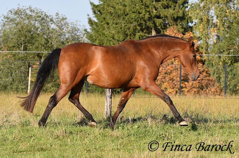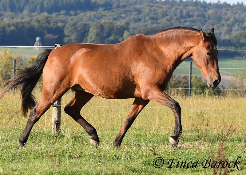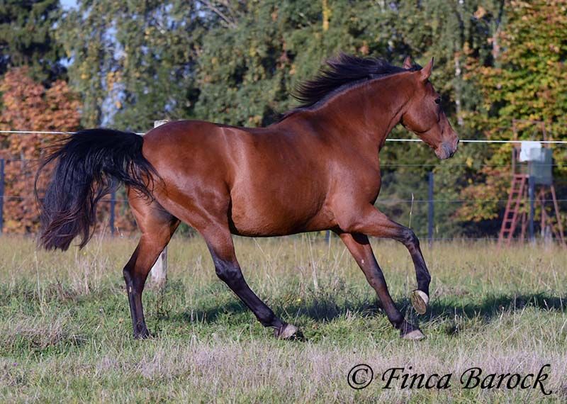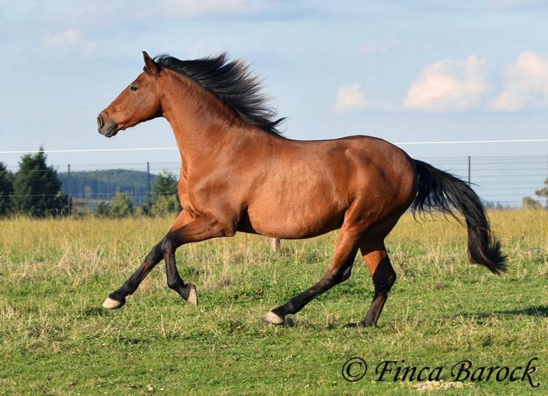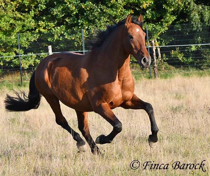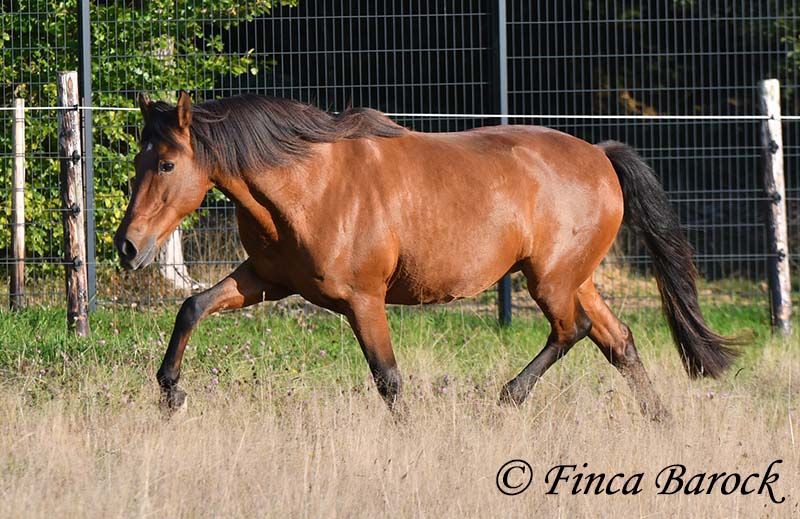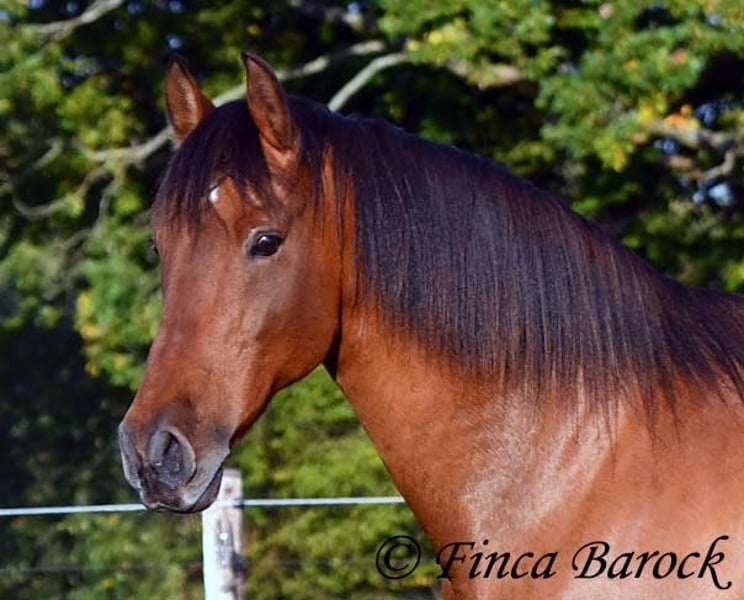 Breed: Andalusian Name: Terry Gender: Gelding Height: 16.1 hh (165 cm) Age: Born July 12, 2009 Color: Brown Price: Price on request Sire: Unknown Dam: Unknown Terry, our comfortable riding professor with a big heart and lots of charm! Terry has been in one owner’s hands for the past 8 years and is only being offered for sale due to his owner’s pregnancy. He is up to date on vaccinations, regularly seen by the dentist, and a lot of suitable tack can be included. He has been barefoot for years and handles outdoor riding well. Terry is well-mannered, affectionate, and friendly in handling. Occasionally, he looks for treats, but he quickly learns there are none available. He loves being out on rides, whether alone or in a group. In many situations, he remains very confident—crossing motorway bridges, splashing through puddles, working in the forest, passing creaking wind turbines—Terry simply goes past without hesitation. In dressage, he is solidly trained. He is familiar with walk-trot, walk-canter transitions, and can perform flying changes. Shoulder-in and travers are very good; traversal movements are well underway and steadily improving. Terry also has a fantastic uphill canter and very comfortable, seat-friendly movements. A good, active walk is part of Terry’s repertoire. During a training session with Diana Krischke, he was also asked for some piaffe steps, which he performed with great motivation. He would definitely benefit from further training in this area. Terry is also used to being ridden by children and less experienced riders. He is well-behaved and forgiving of rider mistakes. Overall, however, he prefers a confident rider. If the rider is distracted by every sound, Terry will notice it too. But if the rider simply continues riding, nearby noises don’t bother him much. He is accustomed to herd life and active stable routines. He enjoys company and is generally good-natured, but prefers his own box and quiet at night. Terry is the perfect dream horse for anyone looking for an experienced partner who is both confident in the terrain and possesses solid dressage training. Contact: Finca Barock, Tel. 0173-696 31 81, 56291 Wiebelsheim