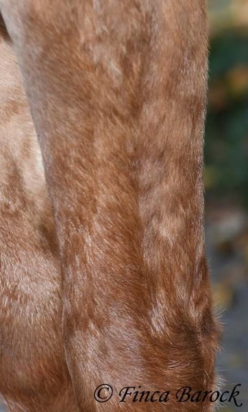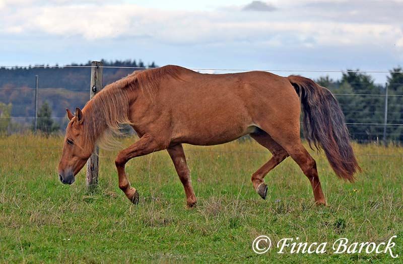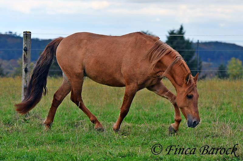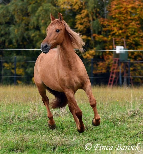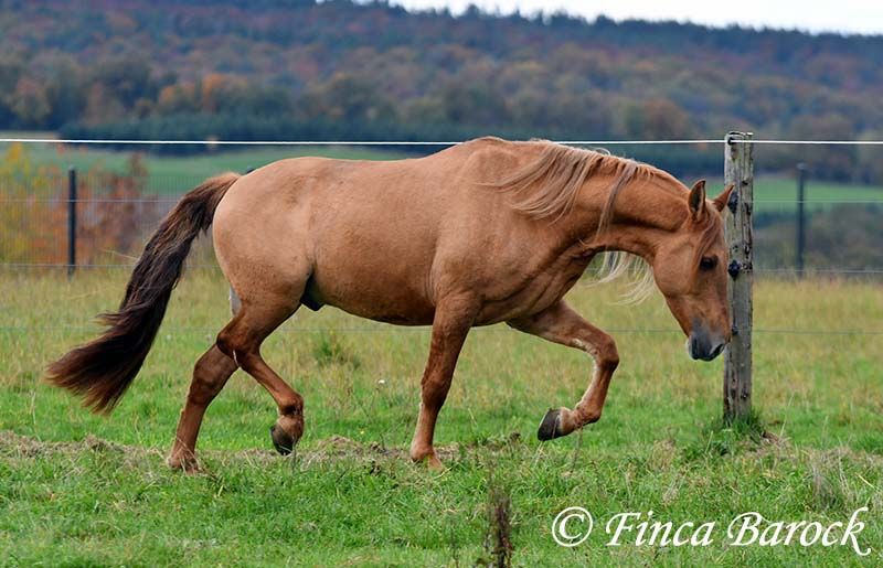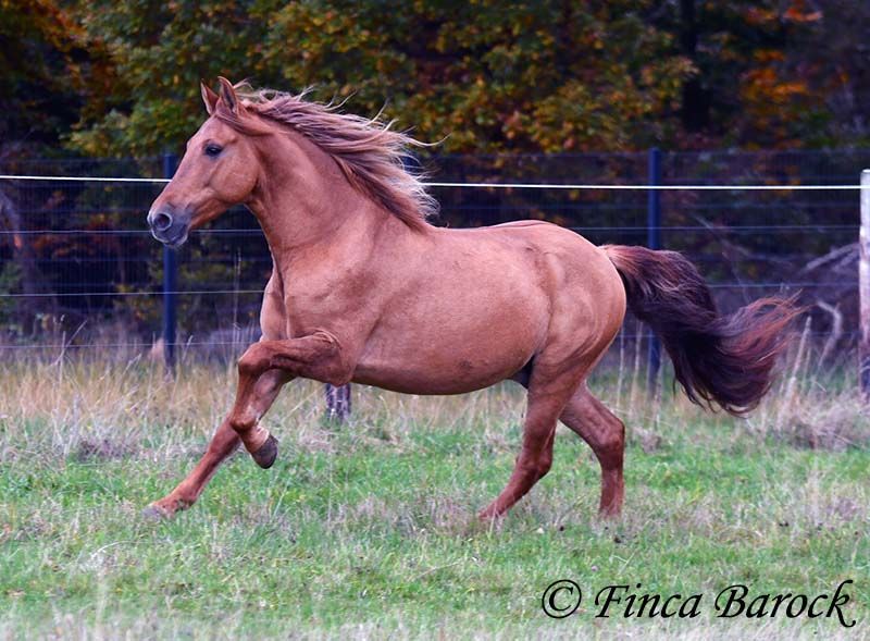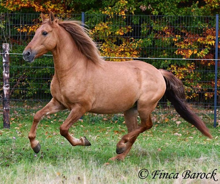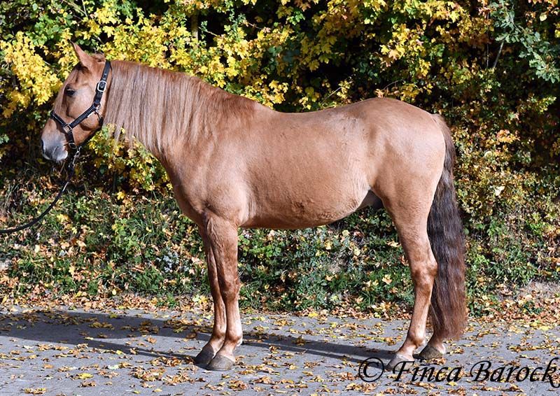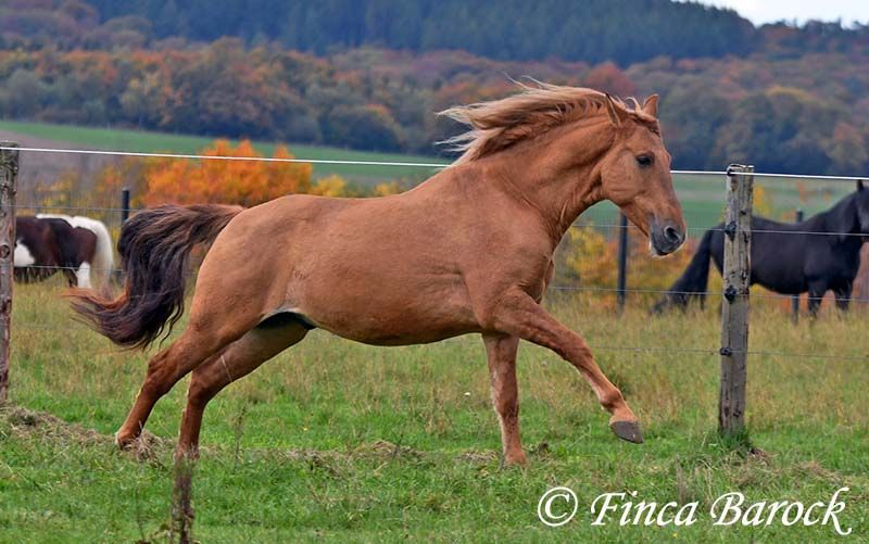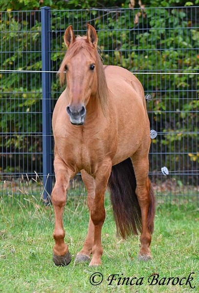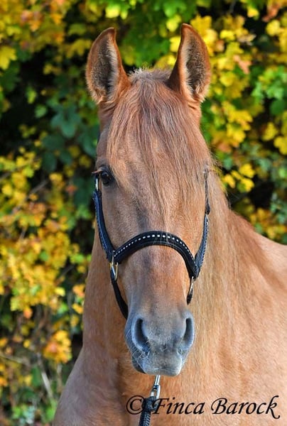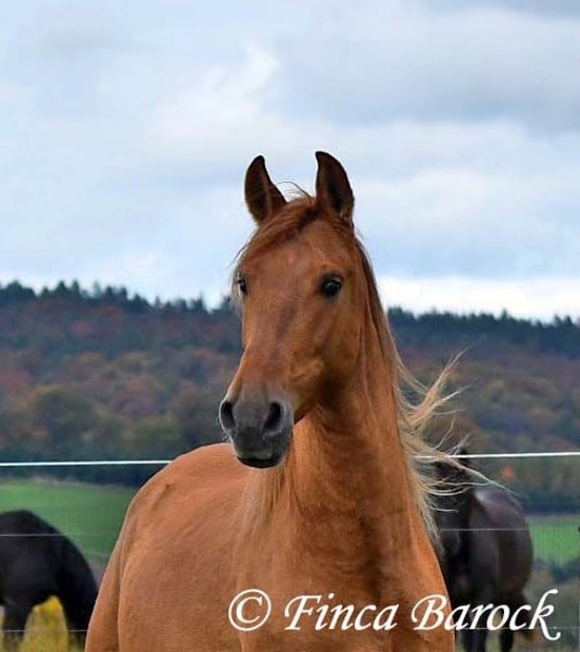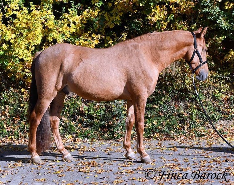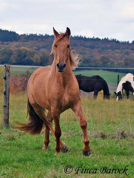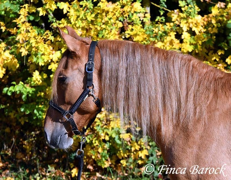 Breed: Andalusian Name: Felipe Gender: Gelding Height: 15.1 hh (154 cm) Date of Birth: August 5, 2022 Color: Chestnut Price: €7,500 Sire: Unknown Dam: Unknown Felipe is a wonderfully affectionate young gelding with a distinctive coat. His friendly nature quickly wins everyone over. He loves grooming, scratching, and cuddling. Felipe is at the beginning of his training, familiar with lunging with saddle, and has been introduced to the bit and bridle on a cavesson. He is gradually getting to know the seriousness of life with us, always at his own pace, and is slowly being backed. He is playful with other horses but remains friendly and easy to handle. Overall, Felipe is a playful colt who enjoys free work and walks. He remains very relaxed around tractors and even barking dogs do not bother him. A compact, raw diamond ready for the next chapter of his life. Includes veterinary clinical examination and X-rays. Contact: Finca Barock, Tel. 0173-696 31 81, 56291 Wiebelsheim