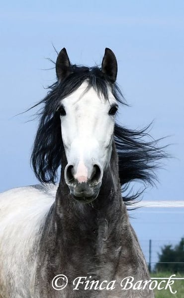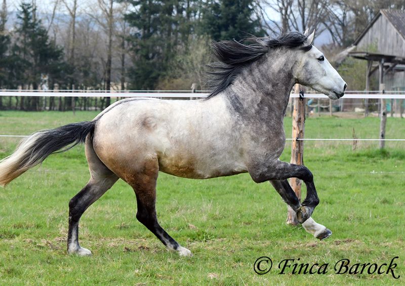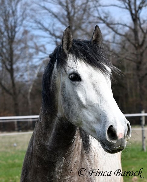 Breed: Andalusian Name: Bambino Gender: Gelding Height: 1.60 m Date of Birth: December 12, 2020 Color: Grey (Dapple Grey) Price: €12,500 Sire: Unknown Dam: Unknown Bambino is an absolute sweetheart and quickly wins everyone over with his friendly nature. He has been ridden in the dressage arena and is more experienced in trail riding than in work within the ring. Trail riding is his absolute specialty. He is comfortable going alone or in a group, often leading confidently but remaining relaxed at the back as well. In the arena, he is currently learning the basics. He responds well and wants to please his rider. He has a lovely uphill canter and comfortable movements. Overall, Bambino is more the type to motivate rather than to be difficult. He is by no means lazy! The clearer the rider’s aids, the easier he is to move forward. Bambino is playful and enjoys everything that can be used for fun—whether it’s a blanket in front of the box or grooming tools within reach, he finds everything interesting to play with. He remains polite with people at all times. He is of sturdy build and provides good coverage for the rider. With him, you get a playful boy with comfortable movements and a friendly character who is eager to grow further with his rider. Includes clinical examination and X-rays. Contact: Finca Barock, Tel. 0173-696 31 81, 56291 Wiebelsheim