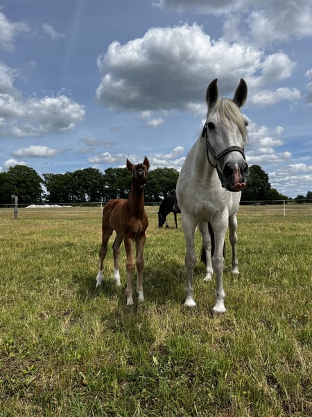 Buenas Noches is a 19-year-old Spanish crossbred mare. Her competitive career was halted in 2021 due to a tendon injury. In 2023, she gave birth to a foal and was subsequently retrained gently, remaining sound throughout. After a further breeding break, Noches had an embryo transfer foal in 2025. She is an excellent mother, and both foalings as well as inseminations were complication-free. We are looking for a loving forever home for Noches. She enjoys staying active and shows great enthusiasm for groundwork and long forest walks. She loves being pampered and is open to new experiences. Noches is not a temperamental mare. She is very pleasant to handle, people-oriented, and communicates calmly and clearly with other horses. For further questions, please feel free to contact us by phone: 0171 2047082