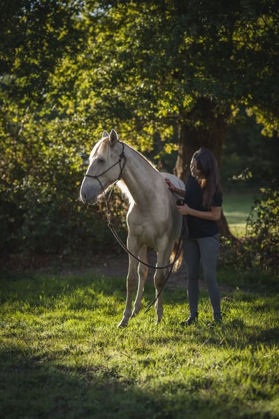 Ojalá di Alambar: puledra PRE PP da Eva Salazar e Yunque la Reina (incredibile stallone dell'allevamento du vencedor nell'ultima foto) nata il 7 Giugno 2024, doppio pearl su base nera. Ojalá è grande e molto ben proporzionata. Promette un modello barocco a desiderare con un'enorme criniera (doppia criniera ondulata). Sarà senza dubbio una cavalla sublime. Ha un carattere molto piacevole, è affettuosa, curiosa e intelligente. Beneficerà di uno svezzamento tardivo, se non naturale, di un'educazione impeccabile e di un completo monitoraggio sanitario: vaccini, vermifugo, ferratura, ecc. È l'unica puledra PRE doppio pearl di Yunque la Reina, un'occasione da non perdere!