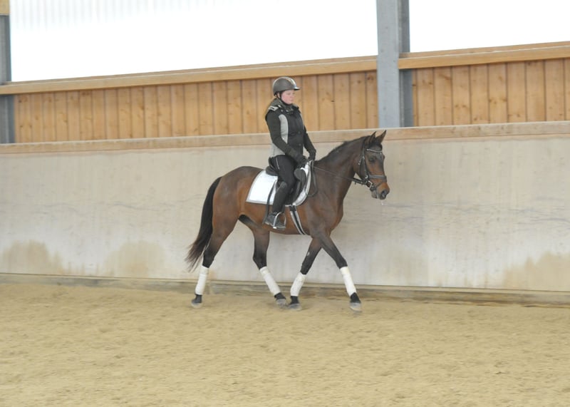 Elegante rittige braune Stute, sehr gelehrig und zeigt sich in der täglichen Arbeit mit Einstellung und angenehmen Sitzkomfort, vermittelt sie ein tolles Reitgefühl. Sie bietet ideale Voraussetzungen für den vielseitigen Einsatz für Freizeit, Halle, Dressur, sowie Geländeausritte. Sie kennt auch Straßenverkehr und Feria.