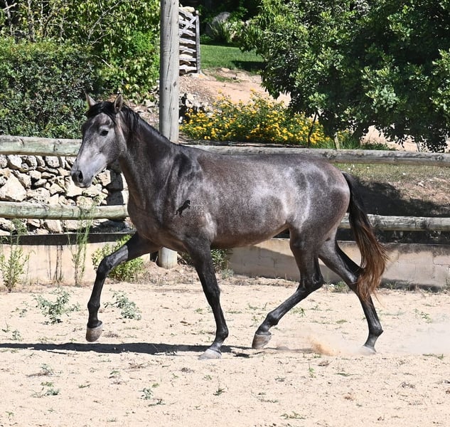 This PRE stallion, born in spring 2023 (Andalusian with breed certification from ANCCE), is still a real youngling. Since he has a lot of Cartujano blood (Cartusian), he is a late developer, as these former horses of the kings take their time to become truly proud and impressive horses. And he is being given time; just a few weeks ago, he was separated from his stallion buddy and is now in a large paddock box. Twice a week, gentle groundwork is done with him, following horsemanship principles, to provide him with a solid foundation for his future life as a riding or driving horse. He already picks up his hooves, allows himself to be groomed, and responds well to body language during groundwork, moving nicely into backing up. He currently stands at 155 cm, with a few more centimeters expected to come—like I said, a late developer ;) Castration on-site would be possible if stallion keeping is not an option. His location is Menorca. Videos and pedigree available upon request. I would be happy to organize a vet check, castration, transport, or even your travel arrangements should you wish to come and see him in person. Details can be found on my page or discussed in conversation.