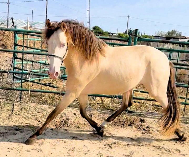 Temperament: Santero is one of the few champagne-colored Baroque stallions. He immediately captivates with his golden (amber) eyes, friendly personality, and zest for life. He is still fully growing, and his beautiful Baroque conformation is already evident. Santero has excellent radiographs, which we are happy to provide. This young stallion has a passport and lives in a loving environment with a well-known show rider. He has not yet been ridden. Upon request and at the buyer’s expense, the dream prince can be gently and carefully backed. For more information, please contact: WhatsApp 0175 861 45 35.