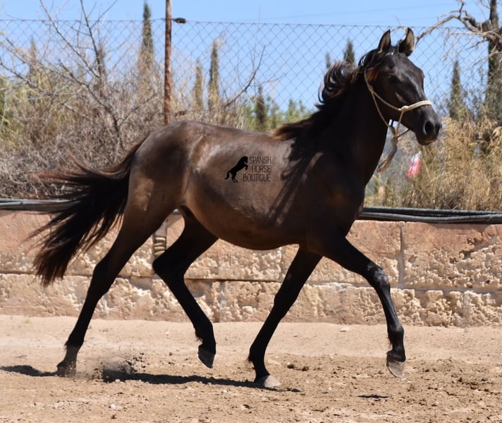 This PRE stallion (Andalusian with ANCCE breed certificate), born 04/2023, is still a little surprise in terms of color! He is registered by the ANCCE as a black stallion, but also shows signs of a dark dun. Since the color test was not done and he is the son of a Perlino, he will either be smoky black or a dark buckskin. In any case: beautiful! And for all those who don't want to be surprised, the color analysis can of course be ordered ;) The young man will not only surprise you with his color, but also with his movement! His long legs sweep across the arena and he really enjoys trotting. He is absolutely fearless and cool - which was a challenge to send him for good photos, but a great representation of his character. At some point you become a big, strong man, so you have to have the courageous character to match. He stands outside 24 hours a day in the company of other boys and is therefore well socialized and hardened. His pedigree, apart from the many special colors such as Perlino, dun and black, is also impressive. He can be traced back to the popular Mejorante stallion Remache XIII and Escalerablut can also be found in his genes. His expected final height is around 160cm. A very cool youngster with great qualities at a very fair price. His location is Mallorca. There is the possibility of leaving him with the breeder for longer. Videos and pedigree available on request. I would be happy to organize an AKU, transport or even your trip if you come to see him in person. Details can be found on my website or in conversation. Saludos from Spain