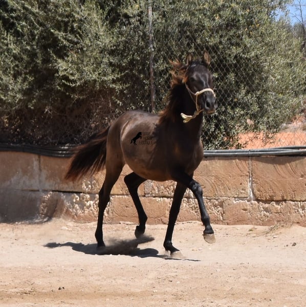 Questo stallone PRE nato ad aprile 2023 (Andaluso con certificato di razza ANCCE) è ancora una piccola sorpresa dal punto di vista del colore! È registrato come morello dall'ANCCE, ma mostra anche segni di essere un baio scuro. Poiché il test del colore non è stato effettuato e essendo figlio di un perlino, potrebbe essere uno smoky black o un baio scuro. In ogni caso: bellissimo! E per chi non vuole sorprese, è possibile richiedere un'analisi del colore ;) Il giovane sorprenderà non solo per il suo colore, ma anche per il suo movimento! Le sue lunghe gambe scivolano con grazia sul terreno e ama davvero trottare. È assolutamente impavido e tranquillo, il che ha reso difficile scattare buone foto, ma è una grande dimostrazione del suo carattere. Un giorno diventerà un uomo grande e forte, quindi deve avere un carattere coraggioso adeguato. Vive in condizioni rustiche, all'aperto 24 ore su 24 in compagnia di altri maschi, ed è quindi ben socializzato e temprato. La sua discendenza, oltre ai molti colori speciali come perlino, baio e morello, è di tutto rispetto. Discende dal popolare stallone Mejorante Remache XIII e ha anche sangue Escalera nei suoi geni. La sua altezza finale prevista è di circa 160 cm. Un giovane cavallo molto interessante, con grandi qualità a un prezzo molto equo. Si trova a Maiorca. È possibile lasciarlo più a lungo per l'allevamento presso l'allevatore. Video e genealogia disponibili su richiesta. Sono felice di organizzare in loco una visita veterinaria, il trasporto o anche il vostro viaggio, se desiderate venire a vederlo di persona. Dettagli disponibili sulla mia pagina o durante la conversazione. Saludos dalla Spagna.