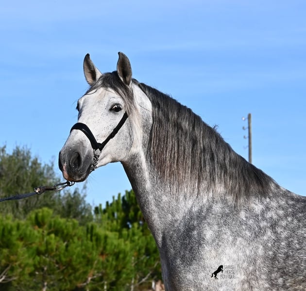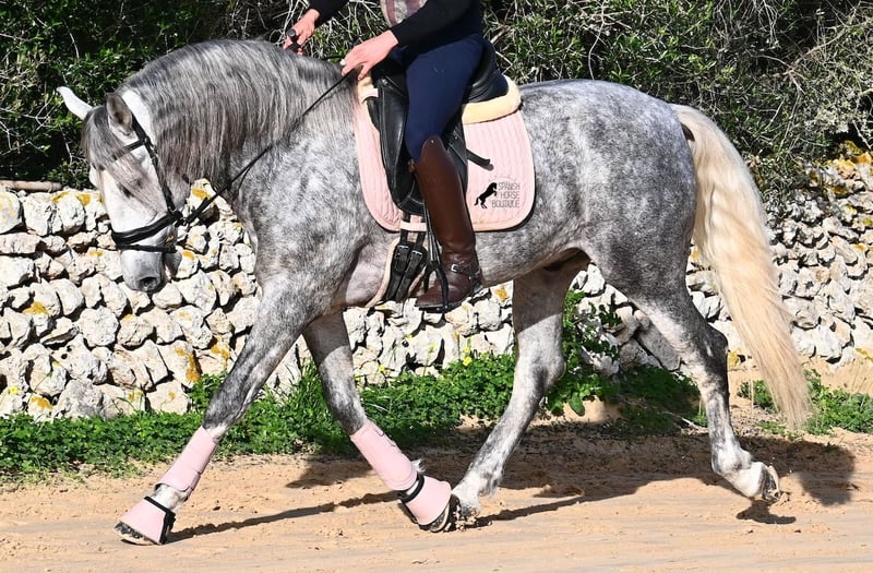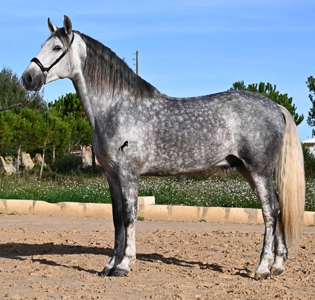 This 2021-born PRE stallion (Andalusian with ANCCE breed registration) is a small, baroque gem. His owner purchased him young (he was also x-rayed at that time, all Grade 1), but unfortunately, he is quite tall, and the stallion has decided to stay in a more manageable size. He has received basic training under saddle on a snaffle bit, but due to his owner's height, he is not able to develop correct leg aids, so a new home is sought with someone better suited physically. This handsome young horse is not only interesting as a riding horse but also for breeders, as his pedigree is outstanding! He is a grandson of Datil VII from RETAMALES, and on his dam's side, he descends from CAMPO BAJO, both lines known for their hardworking traits. His pedigree also includes PLAZA DE ARMAS and YEGUADA MILITAR (Cartujano). Under saddle, lateral work has already been introduced, and his conformation greatly benefits his movement, making him also suitable for working equitation. His canter is uphill and balanced, and he is increasingly learning to stretch and lift his back. He enjoys hacking out, and the variety from the arena helps him stay mentally fresh. He is kept in a paddock box but is also familiar with pasture turnout and full box stall housing. For those who cannot keep a stallion, castration on-site is an option. With a current height of 157 cm, he will remain compact and retains the classic type of the Spanish horse. He has not yet been used for breeding and is accustomed to being near mares. Price reflects his quality. His location is Menorca. Videos and pedigree details are available upon request. I am happy to arrange a pre-purchase exam, training, castration, transport, or even your trip to view him in person. Further details can be found on my website or through a direct conversation. Greetings from Spain