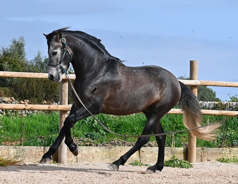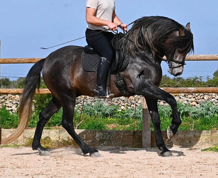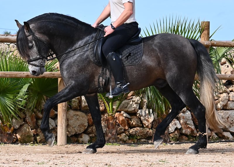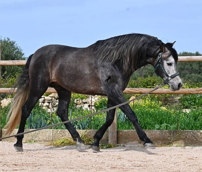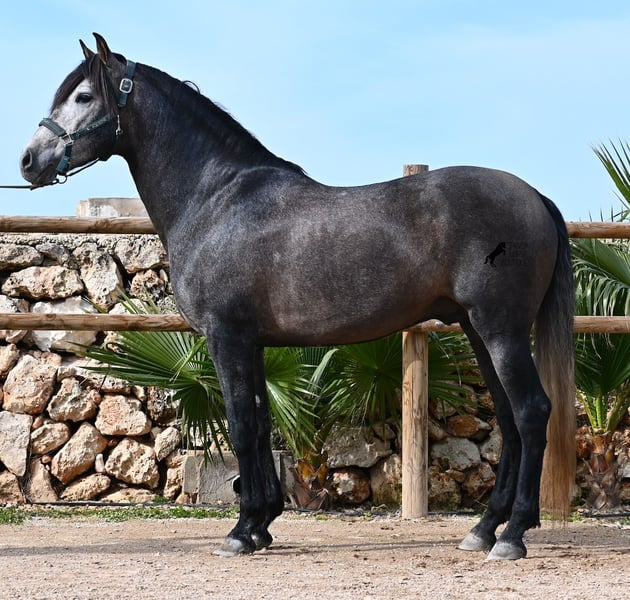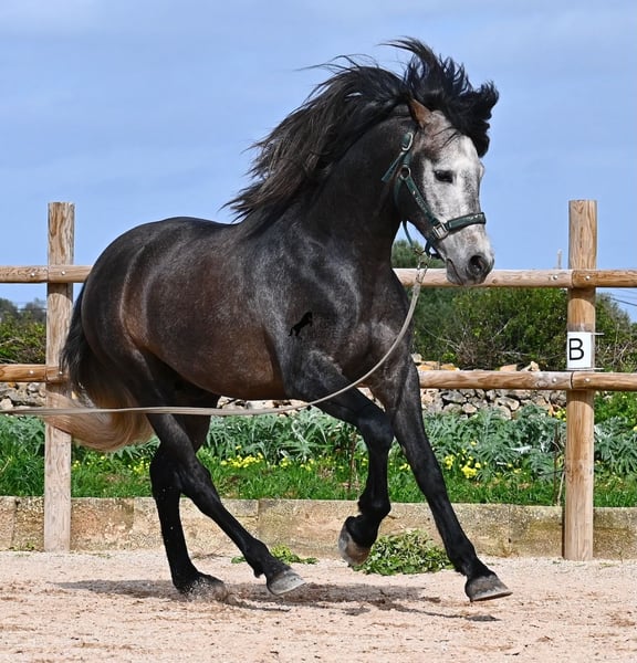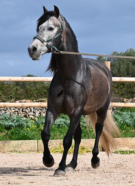 Dieser 2021 geborene, reinrassige PRE Hengst (Andalusier mit Rassenachweis der ANCCE), kommt von einem sehr pferdefreundlichen Züchter. Bis 3.5 Jahre durfte der Bursche komplett roh in der Hengstherde aufwachsen und einfach Pferd sein und seine Sozialkontakte bestens pflegen. Nun lebt er in einer großen Paddockbox und als Nachbarn hat er seine Kumpels, mit denen er großwerden durfte. Diese Aufzucht und Haltung macht sich bezahlt, denn er ist absolut tiefenentspannt, dem Menschen gegenüber sehr achtsam und selbst wenn ihm beim Putzen ein Pony am Schweif herumzupft, weil der Paddock neben dem Putzplatz ist, wackelt er nicht einmal mit den Ohren. Er ist ein ganz ruhiger und in sich ruhender Bub, was auch in der Ausbildung berücksichtigt wird. So wird weder mit Hast noch Unruhe gearbeitet, sondern ihm wird Zeit gegeben und er ist zwar im Ausbildungsstand eher mit einem 4jährigen zu Vergleichen, aber das ist nur ein Vorteil, wenn man weiß und merkt, es wird schonend gearbeitet (aktuell 3x pro Woche). Es werden immer wieder Ruhephasen am langen Zügel gemacht und er lernt immer besser sich zu strecken, was schön zu sehen ist. Trotz steiniger Böden geht er auch im Gelände problemlos barhuf und hin und wieder den Reitplatz gegen einen schönen Ausritt zu tauschen, das mag er auch gerne. Schon als Fohlen war er sehr barock und sein Exterieur ist vom "alten Schlag". Dafür steht auch seine Abstammung, denn er ist MONIS, SA SINIA, CAMPO BAJO und YEGUADA MILITAR gezogen (Cartujano). Mit aktuell 157cm ist seine Größe auch harmonisch zum Exterieur und er ist kompakt, dabei aber wendig, was ihn auch für die Working Equitation oder Westernreiten interessant macht. Unterm Reiter ist er mit der Aufmerksamkeit immer beim Menschen und sehr bemüht. Er hält auch schon relativ gut den Kontakt, aber altersbedingt braucht er noch etwas mehr Gleichgewicht und Schub von hinten (wie gesagt, er wird nicht gehetzt in der Ausbildung sondern langsam aufgebaut). Er wird auf Wassertrense geritten und laterale Arbeiten sind angefangen- ansonsten hat er eine stabile Basisausbildung. Auch im Umgang ist er ein Gentleman, sei es beim Hufe geben oder satteln (Videos vorhanden). An der Hand lernt er den spanischen Schritt und hat beim Standbild gezeigt, wie gut er den kann und wie schön seine Schulterfreiheit ist ;) Für all jene, denen keinen Hengsthaltung möglich ist, besteht selbstverständlich die Option der Kastration vor Ort. Sein zu erwartendes Endmaß wird um die 160cm, jedoch durch sein barockes Erscheinungsbild wirkt er größer und deckt sehr gut ab. Sein Standort ist Menorca. Videos und Abstammung gerne auf Anfrage. Gerne organisiere ich vor Ort eine AKU, Beritt, Kastration, Transport oder auch ihre Reise, sollten Sie persönlich zum Anschauen kommen. Details dazu gerne auf meiner Seite oder im Gespräch. Saludos aus Spanien