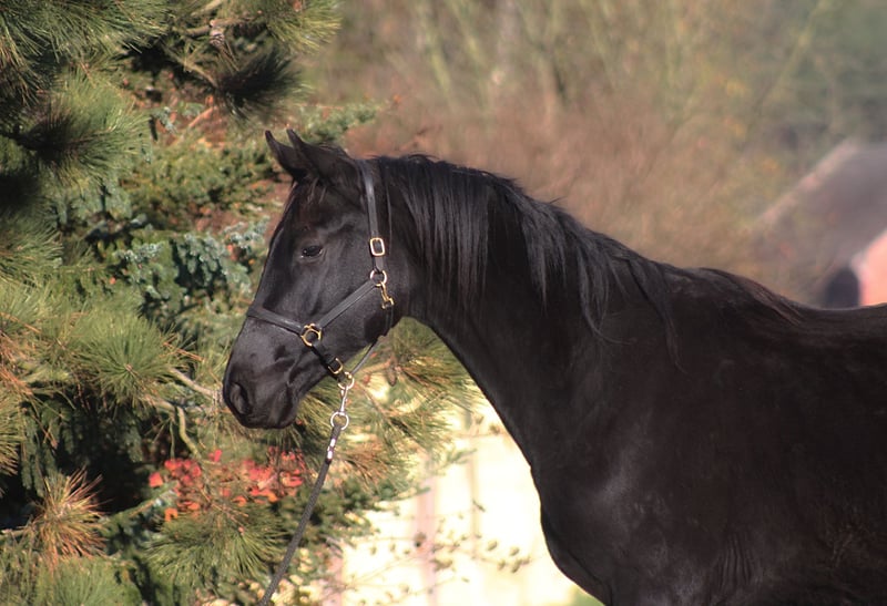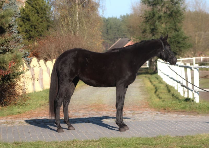 For sale 3 yo lovely gelding in jet black color He is by Emark - amazing black dressage polish stallion, compete in high level. Also many more best Anglo Arabian horses such as Jalienny , Efekt, Veritas etc...in the pedigree, suitable for dressage, eventing or just leasure rides for tall rider Grandsire The Anglo Arab stallion All That Jazz was imported to Biddesden from Victoria in Australia as a colt. His sire is the Arab stallion SS City Lights who was bred in the USA and nearly 16 hands. His dam is Belingo, an Australian Thoroughbred by Saulingo. Jazz was always a tall colt with great scope to his stride. He has the softest and springiest of canters as all who have been lucky enough to ride him will attest. He was taken through the ranks to advanced level in British Eventing by William Fox-Pitt and went hunting for a season with the South and West Wilts. His foals have been successful in the show ring and have made a promising start in eventing, with their big strides and elegant steady head positions. Also australian, both arabian and thouroughbred horses are well known and appreciated for their hardness and durability and have achieved many successes in international endurance ! LORENZO AA is Of exceptional beauty , long-legged and well built, with elastic and extensive movement. Long neck, beautiful subtle head. He is now 172/3 cm high at 3 yo cm, and final estimate height about 175 cm !!! Born and raised on big meadows, pastured every day with a group of youngsters. He has exceptional fantastic character, absolutely people oriented, very friendly and calm. Interesting for sport or leisure rides . Full pedigree, e-pass, vaccinated, dewormed etc. The price will increase with trainig level, once he will be started under the saddle. Located western Poland near PL/D border . Price + 8% VAT Transport can be arranged . Contact by WhatsApp + 48 513 179 245