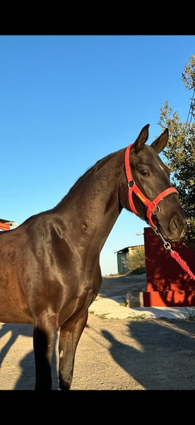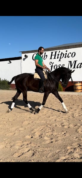 Caballo cruzado padre lusitano madre Anglo árabe. Hace espaldas adentro, cesiones a la pierna, apoyos y piruetas, está empezando con los cambios de pie. Sale al campo y a romerías