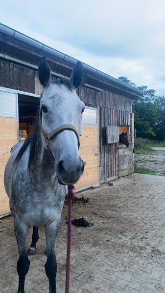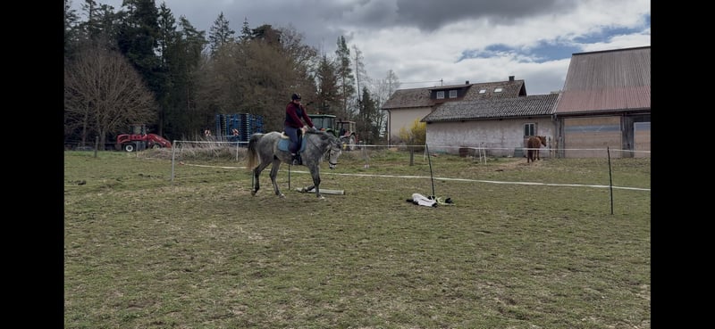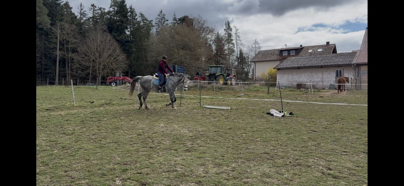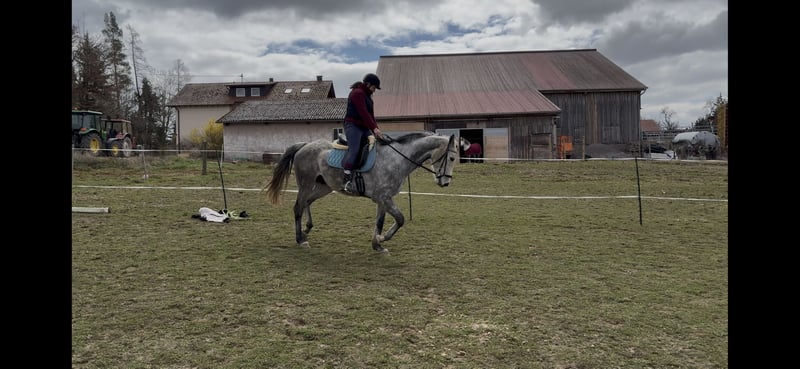 Im Gelände ist er aktuell nicht sicher!Besonders alleine wird er sehr unruhig und tänzelt viel, weshalb er vorerst unbedingt auf dem Reitplatz oder in der Halle weiter trainiert werden sollte und am Vertrauen gearbeitet werden muss.