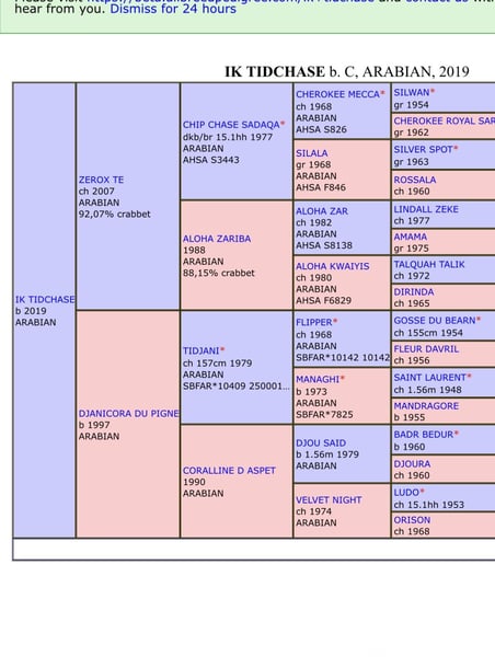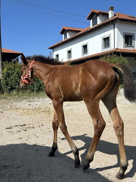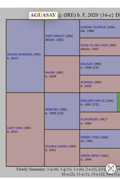 Potra Anglo-árabe 50% origenes super exclusivos. Deep Impact (JPN) Saxon Warrior (JPN) Montjeu (IRE) Galileo (IRE) 2x Sadlers Wells (USA) Green Tune (USA) Por linea materna. Por linea paterna: Chip Chase Sadaqa (AUS) Zerox TE (AUS) Aloha Zar (AUS) Talquah Talik (AUS) Tidjani (FR) Djou Said (FR) Bard Bedur (FR)