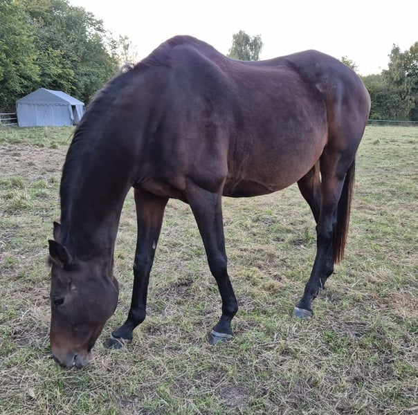 For sale is a 20-year-old brown mare. She has a height of approximately just over 1.60m. A few weeks ago, we started retraining her after about a year off from riding (due to the owner's illness). Super nice horse, very light to the aids, can be ridden with "a little finger," with a healthy go, not suitable for beginners. Currently, she has some balance issues in the canter due to not having fully rebuilt her musculature yet. However, with some training, this will surely not be a problem for long. Very people-oriented, she enjoys attention and loves to be cuddled. She stands very calmly at the grooming area and loves to be pampered. We wish for her a great home as a companion or also as a riding horse in leisure activities with a more experienced rider. According to the previous owner, the mare has already had 5 or 6 foals, pedigree see photos. We vaccinated her once last month (influenza and tetanus). Her hooves have been freshly done, she was last dewormed in May, and her teeth are in good condition, having been done in January. She is currently still on pasture 24/7 and is also familiar with being in a stable at night. We are not aware of any illnesses, and she has not shown any unusual behavior with us so far. Price is negotiable, perhaps the right person for this wonderful mare will be found here. The mare is sold privately, without warranty and excluding any liability for defects.